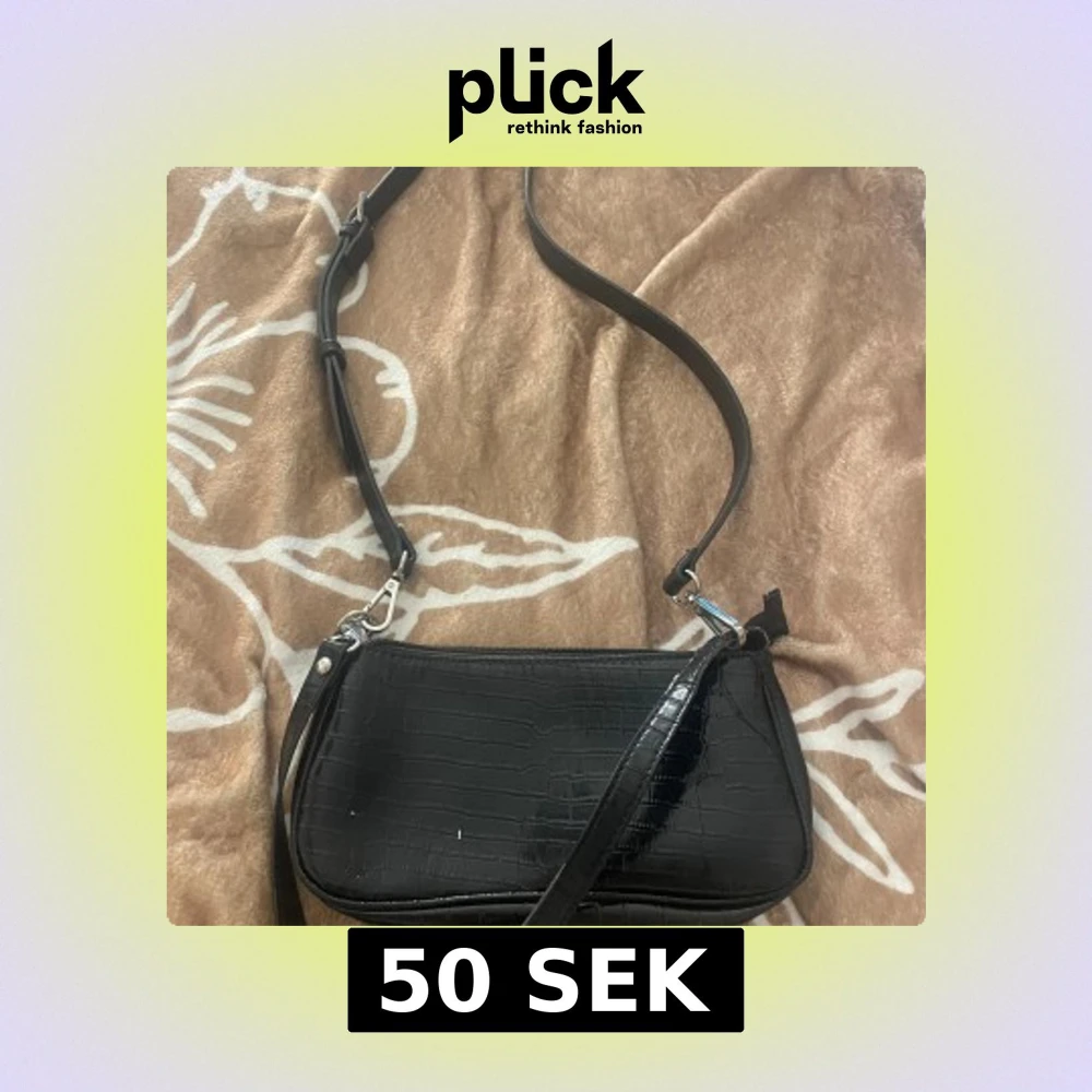 Snygg svart axelväska med krokodilpräglat mönster. Väskan har en justerbar axelrem och stängs med dragkedja. Minns inte nypriset på väskan