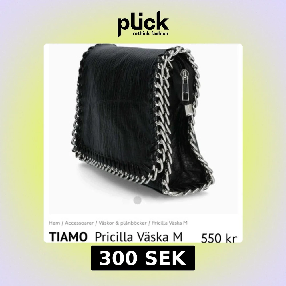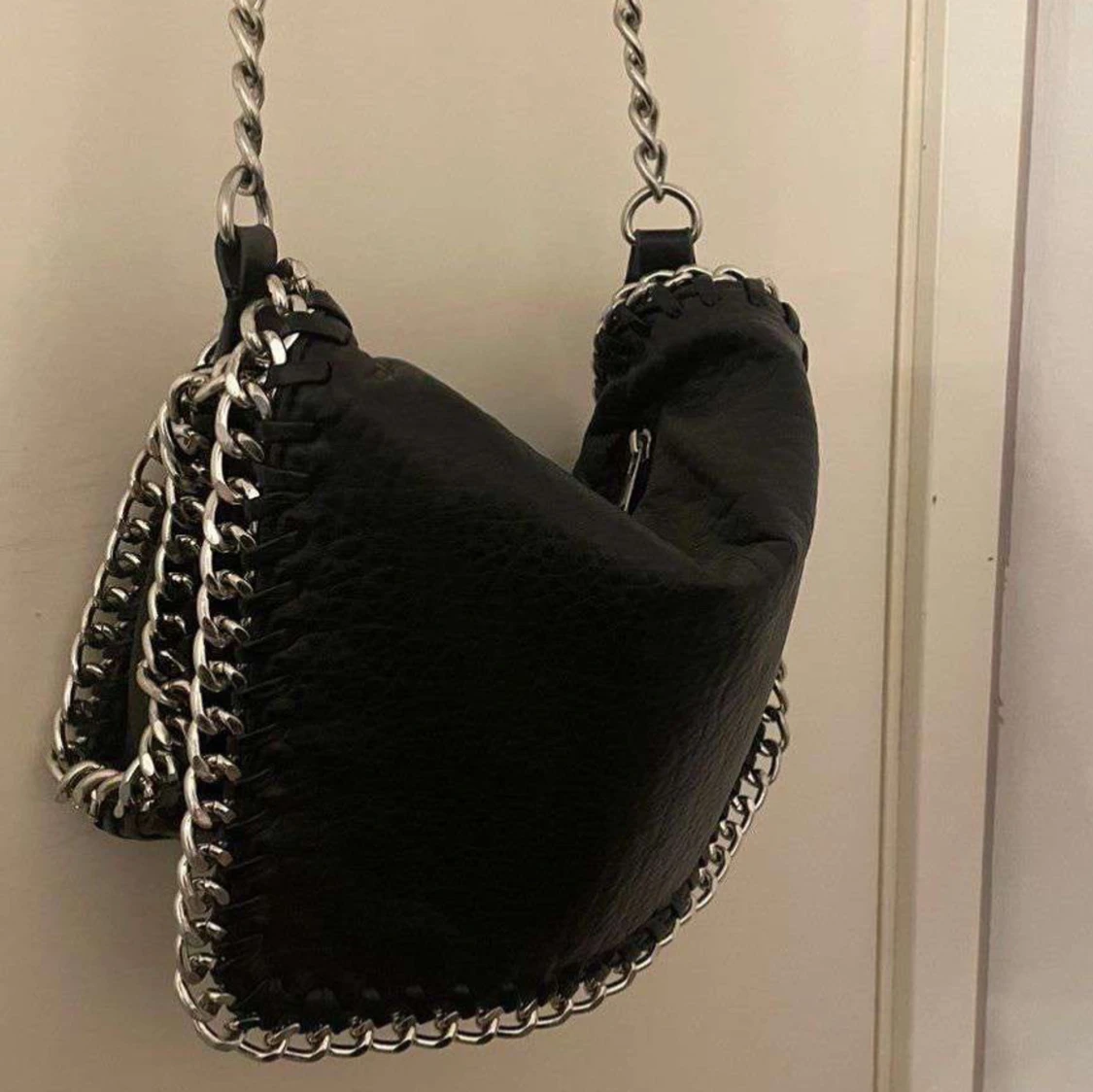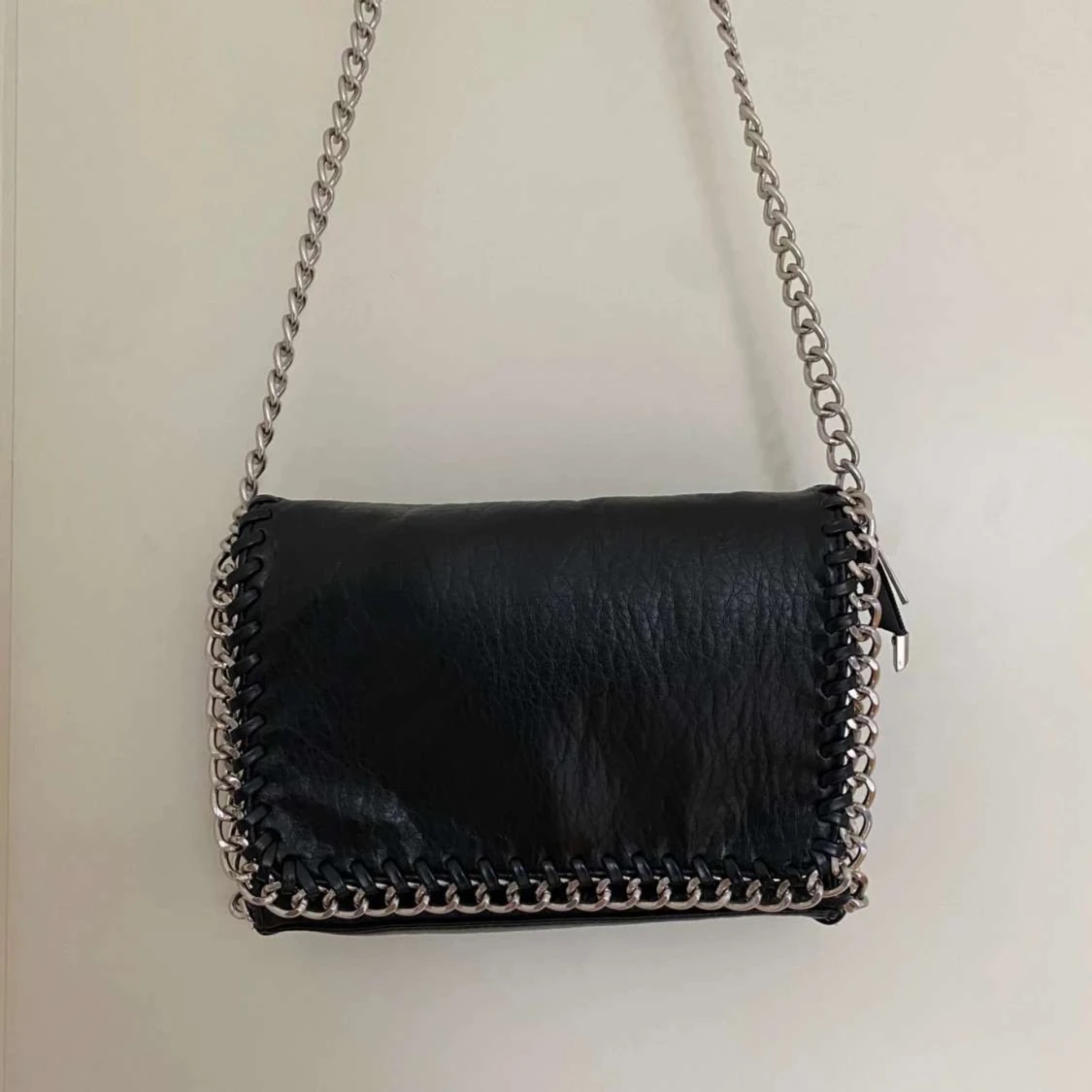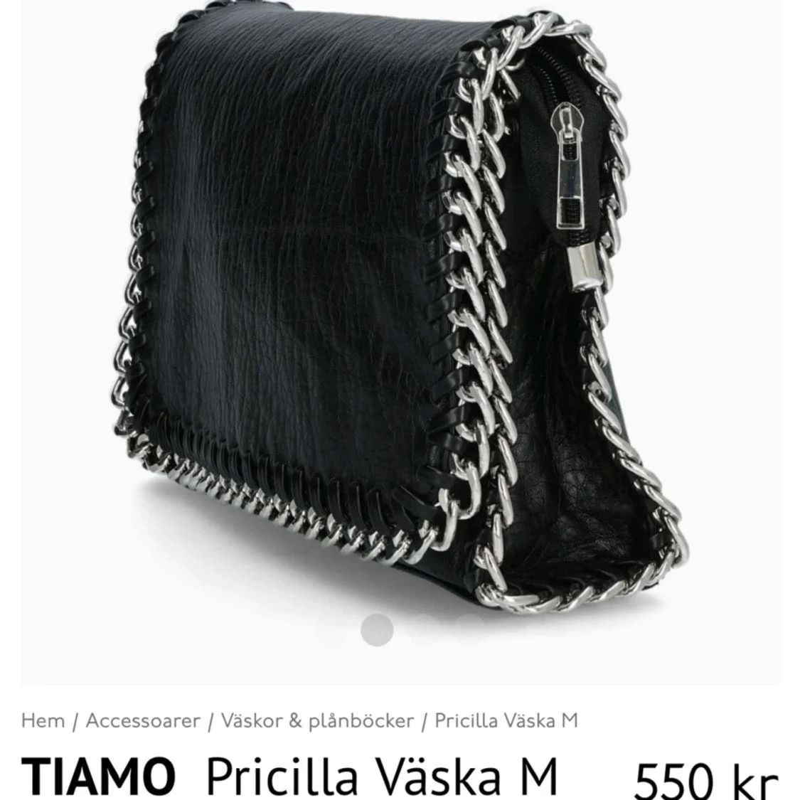 Svart axelväska från TIAMO i skinnimitation med silverfärgad kedja som axelrem och runt kanterna. Väskan har dragkedja upptill och på baksidan.