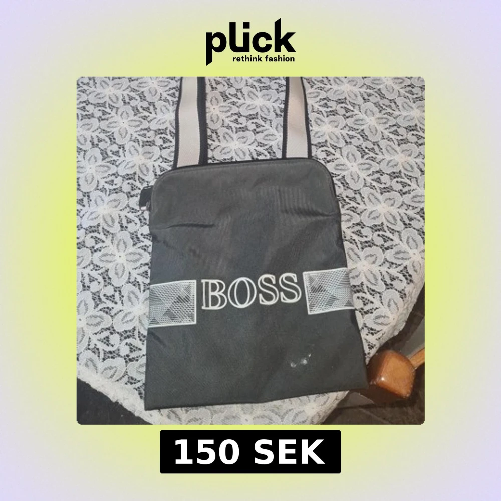 Snygg svart axelväska från Boss med vita detaljer och logotyp framtill. Väskan. Säljer den då den inte används' en av bokstäverna e lösa men går bara att limma fast lite!