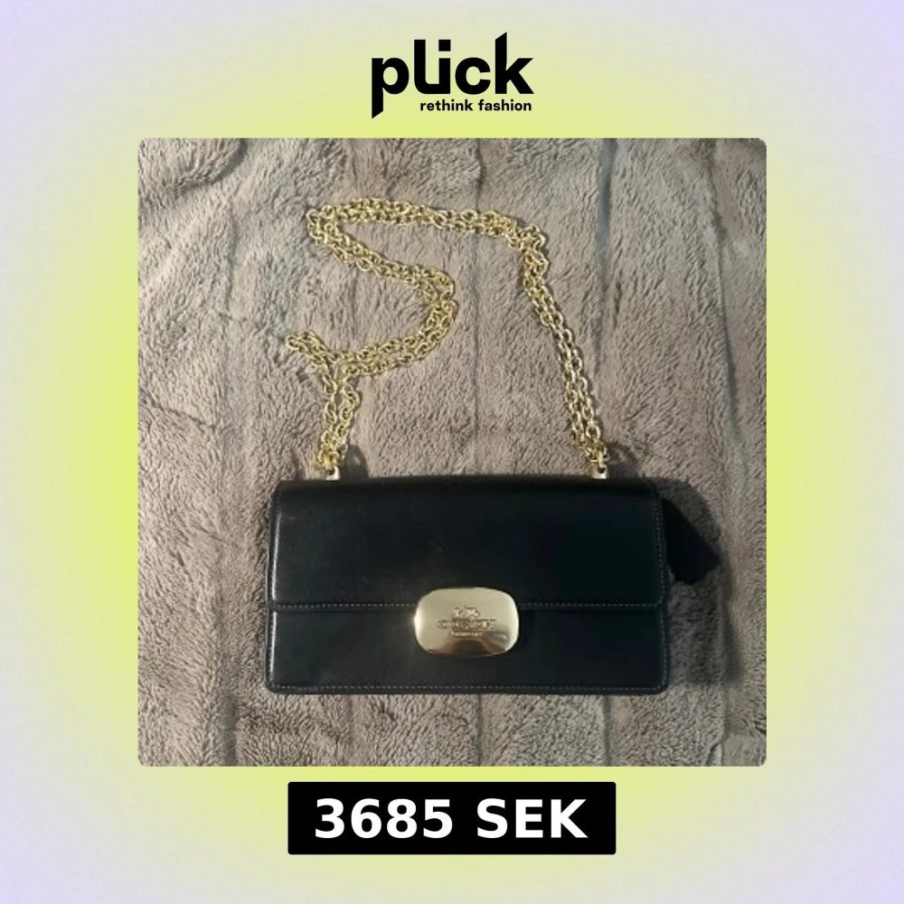 Stilren svart axelväska från Coach i slätt skinn med guldfärgad kedjerem och elegant logga på metallspännet. Kedjan går att göra kortare eller längre beroende på hur man vill bära väskan. Väskan har ett klassiskt rektangulärt format lock och insida i ljusbrunt material. Perfekt för dig som gillar lyxiga detaljer och tidlös design.