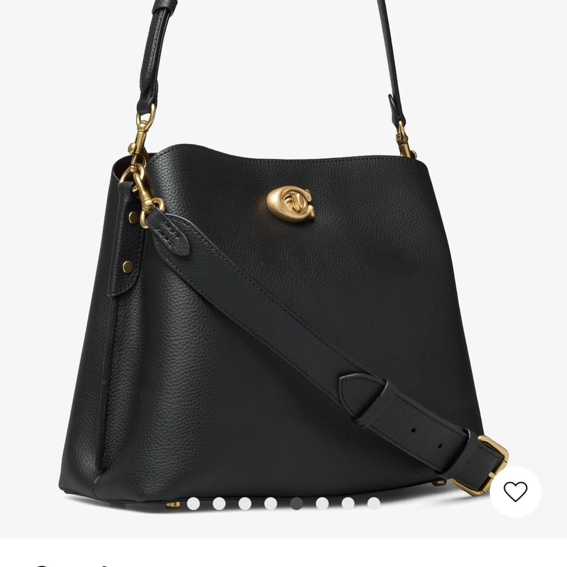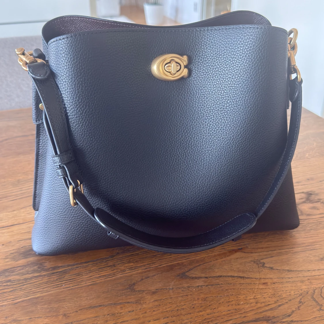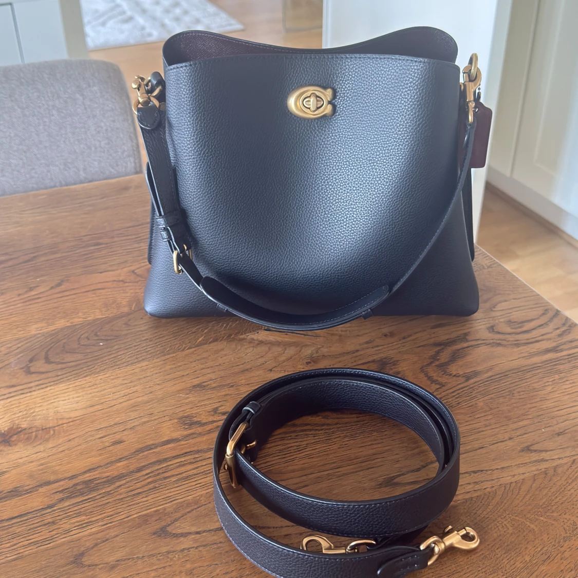 Stilren svart axelväska från Coach i mjukt, kornigt skinn med guldfärgade metalldetaljer och klassiskt vridlås framtill. Väskan har justerbar axelrem och extra rem för crossbody, perfekt för dig som gillar en clean och lyxig look.