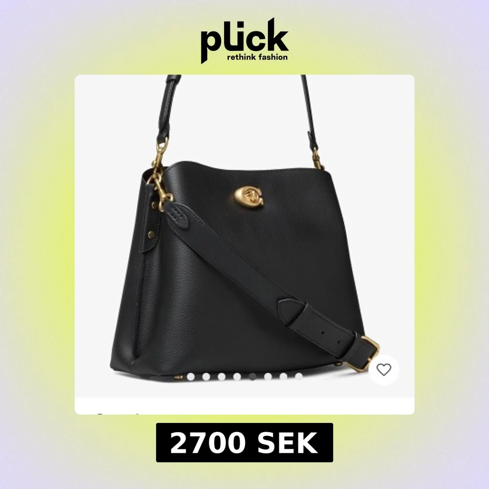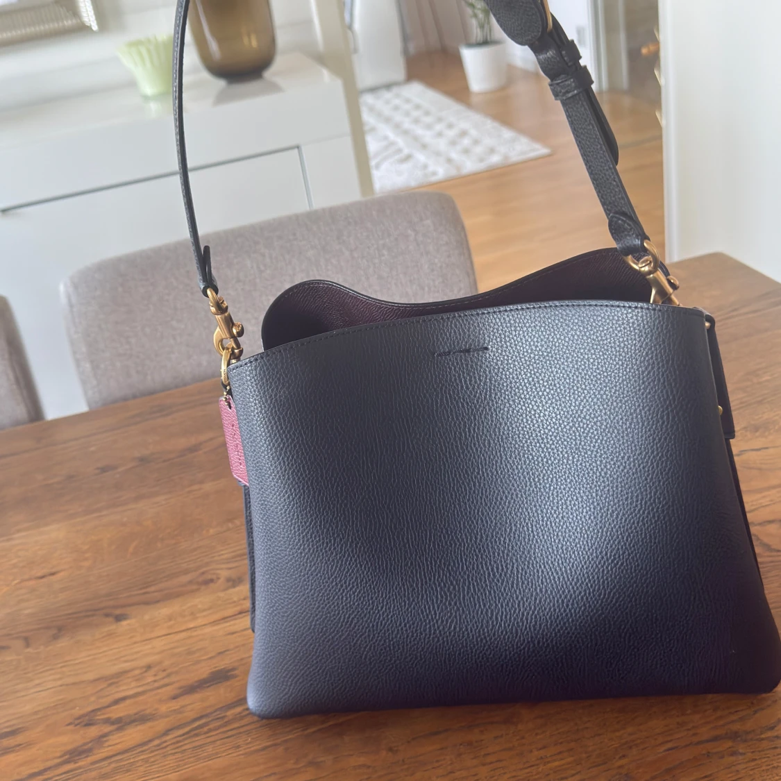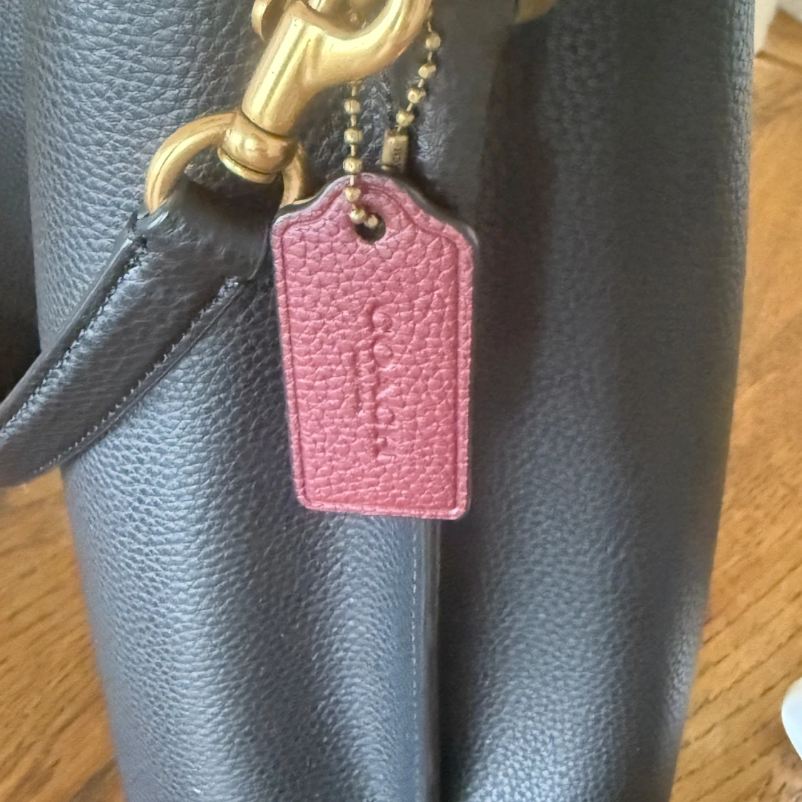 Stilren svart axelväska från Coach i mjukt, kornigt skinn med guldfärgade metalldetaljer och klassiskt vridlås framtill. Väskan har justerbar axelrem och extra rem för crossbody, perfekt för dig som gillar en clean och lyxig look.