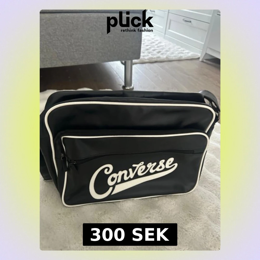 Säljer en svart axelväska från Converse med vit logga och vita detaljer. Väskan har justerbar axelrem, stort huvudfack och en framficka med dragkedja. Klassisk retrostil och tillverkad i syntetmaterial.