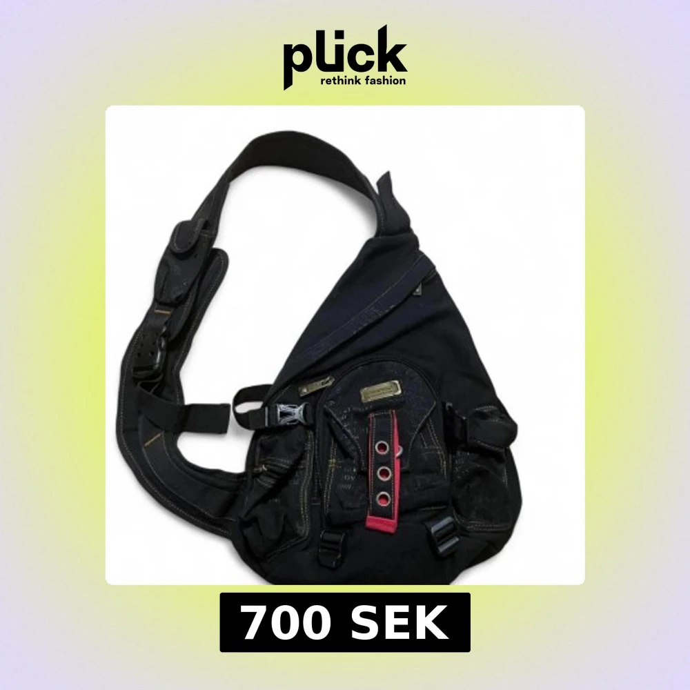 Cool svart axelväska från Diesel med bred rem, flera fickor och detaljer i rött och silver. Väskan har spännen, dragkedja och en unik design med metallplatta och öljett-detaljer. Perfekt för dig som vill ha en streetstyle-vibe.