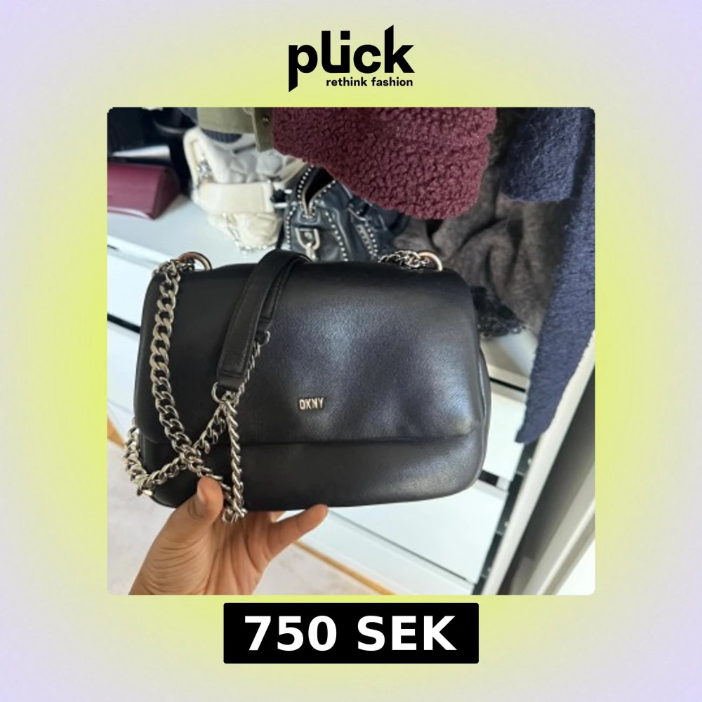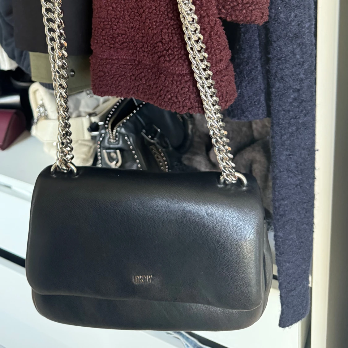 Säljer en stilren svart axelväska från DKNY i mjukt skinn med silverfärgade kedjor som axelrem. Väskan har en enkel och klassisk design med DKNY-logga framtill. Perfekt storlek för det viktigaste och ger en snygg touch till din outfit.