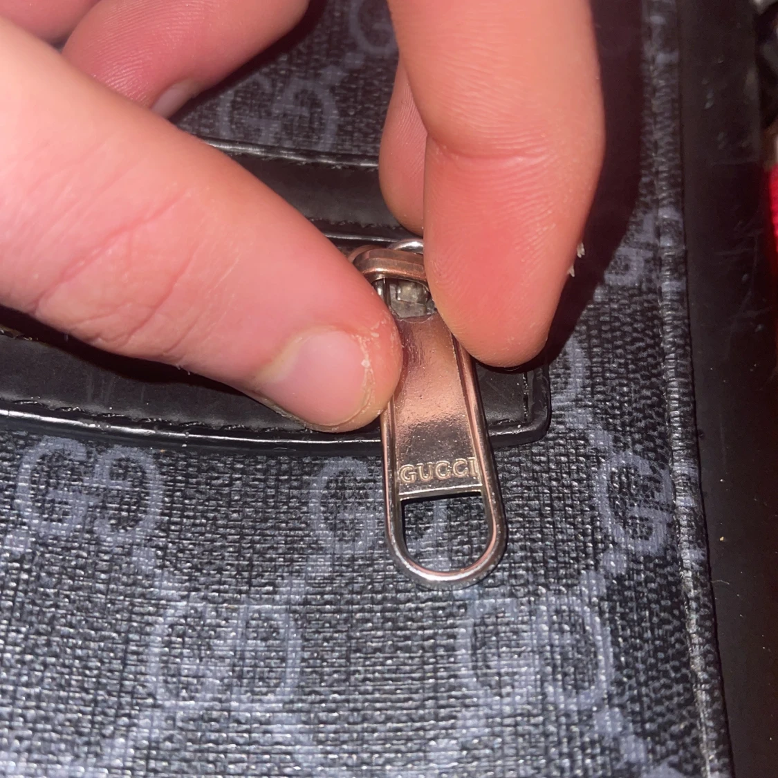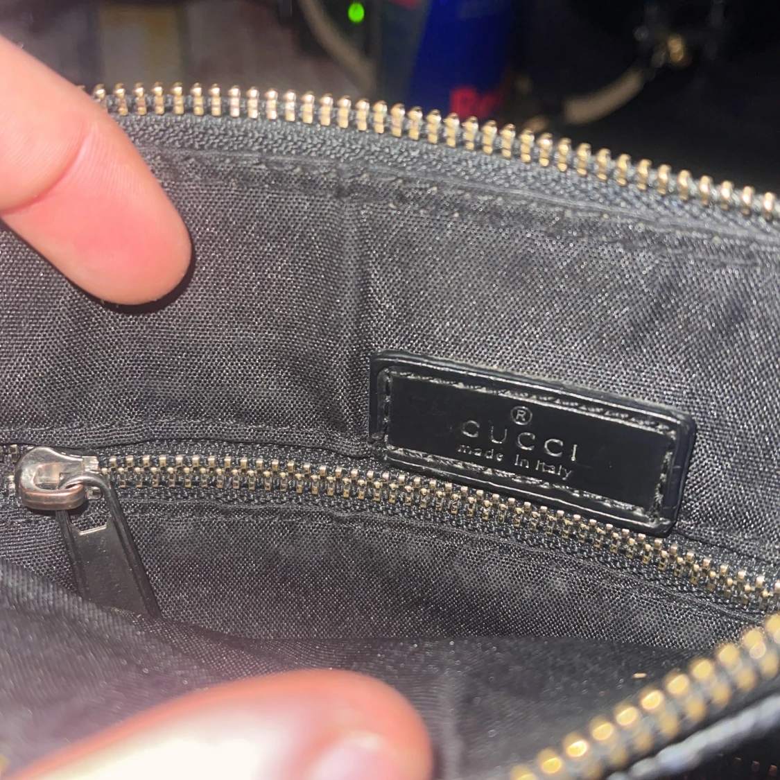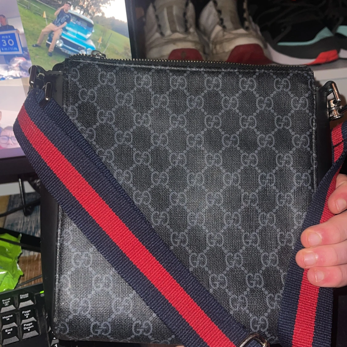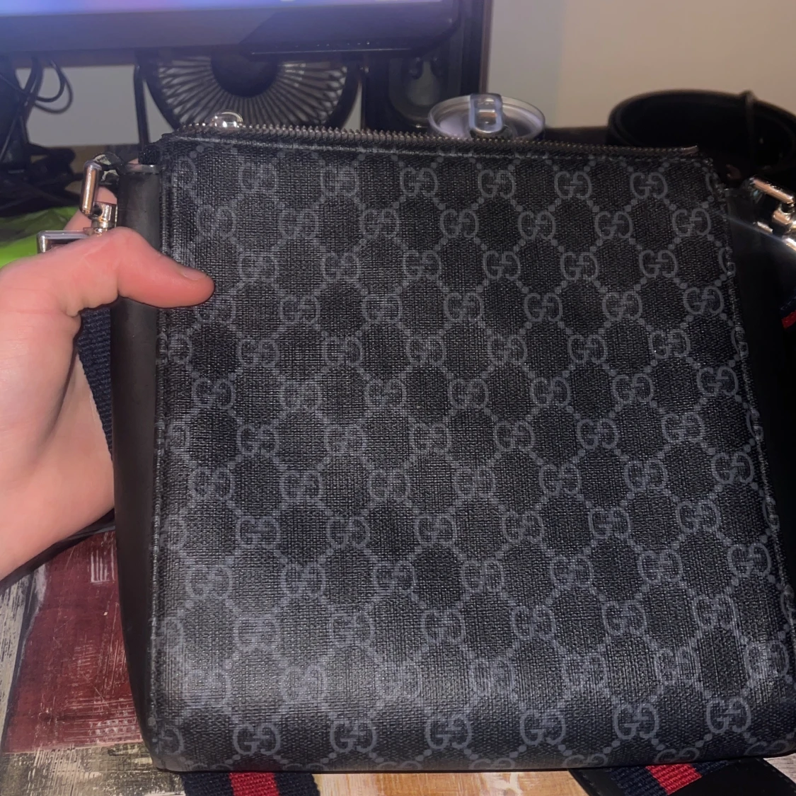 Snygg svart axelväska från Gucci med det klassiska GG-mönstret. Väskan har en justerbar axelrem i rött och blått, samt en praktisk dragkedja framtill. Perfekt för att bära dina nödvändigheter med stil.