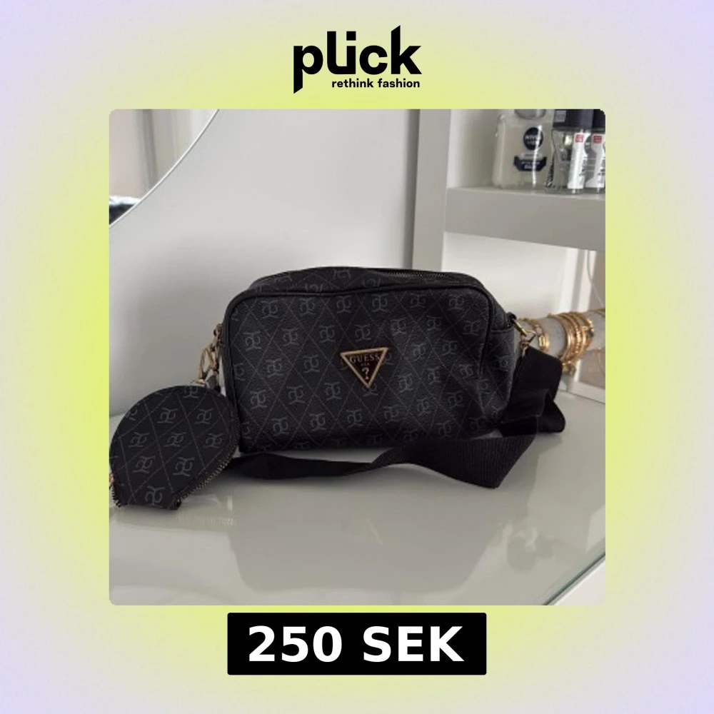 Snygg svart axelväska från Guess med justerbar rem och guldfärgade detaljer. Väskan har ett diskret mönster med loggor över hela ytan och en praktisk liten rund ficka på sidan. Tillverkad i syntetmaterial och stängs med dragkedja.