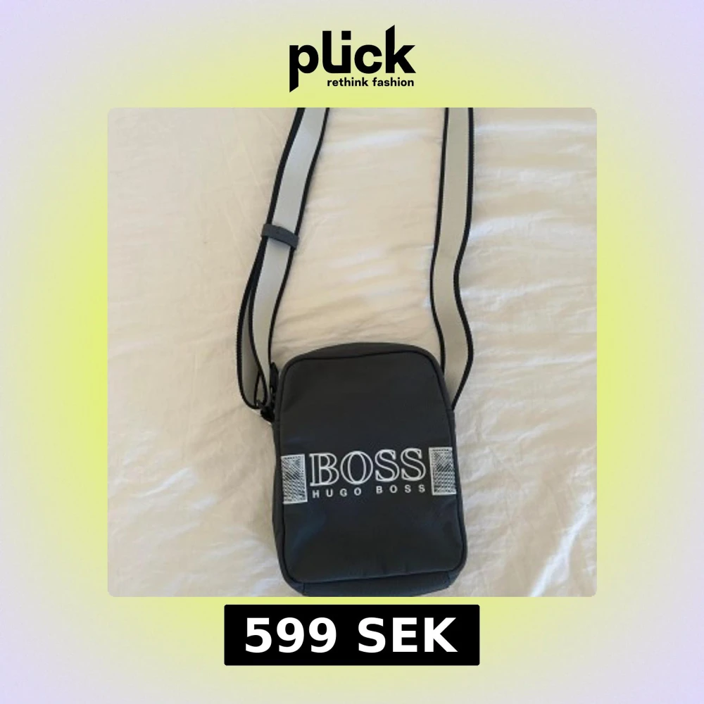 Snygg svart axelväska från Hugo Boss med justerbar axelrem. Väskan har en stilren design med vit logotyp på framsidan och är perfekt för att bära med sig det nödvändigaste. Praktisk och enkel att matcha med olika outfits. Knappt använd. Nypris ca 1100kr. Pris kan diskuteras