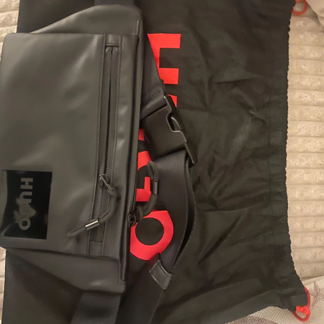Snygg svart axelväska från Hugo med stilren design och justerbart band. Väskan har en praktisk dragkedja framtill och en diskret logga i svart på framsidan. Tillverkad i ett tåligt syntetmaterial som ger en modern känsla.