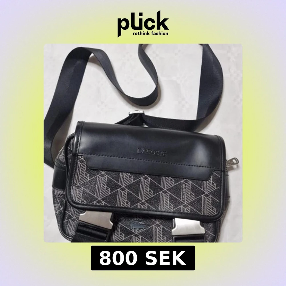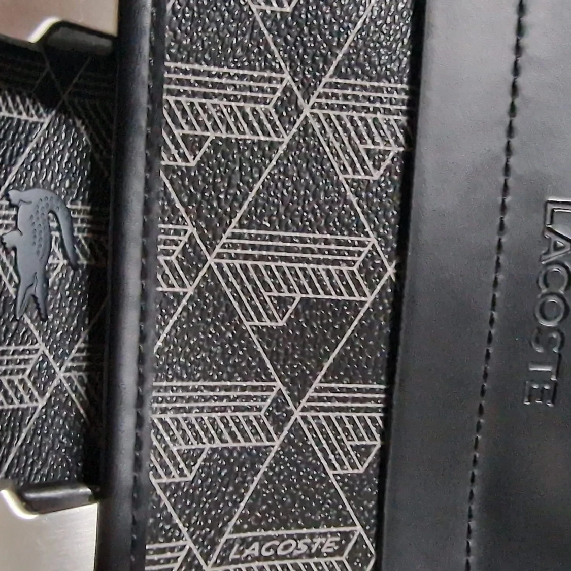 Snygg svart axelväska från Lacoste med geometriskt mönster och silverfärgade detaljer. Väskan har justerbar rem, lock med präglad logga och smarta fack. Materialmix av skinn och syntet ger en modern vibe.