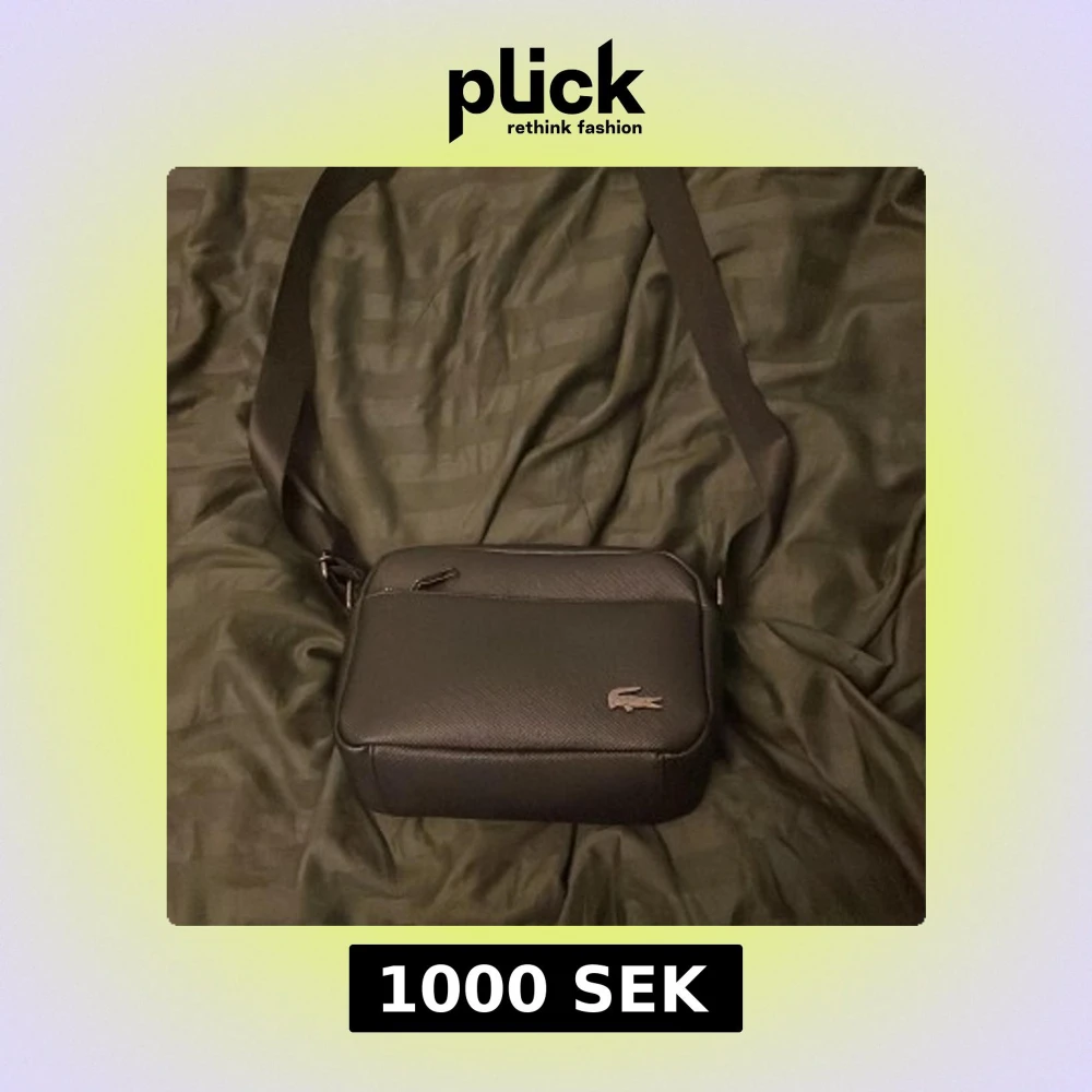 Snygg svart axelväska från Lacoste med klassisk krokodil-logga i metall på framsidan. Väskan har en justerbar axelrem, dragkedja upptill och ett extra fack med dragkedja på baksidan. Tillverkad i slätt syntetmaterial med stilren och enkel design.