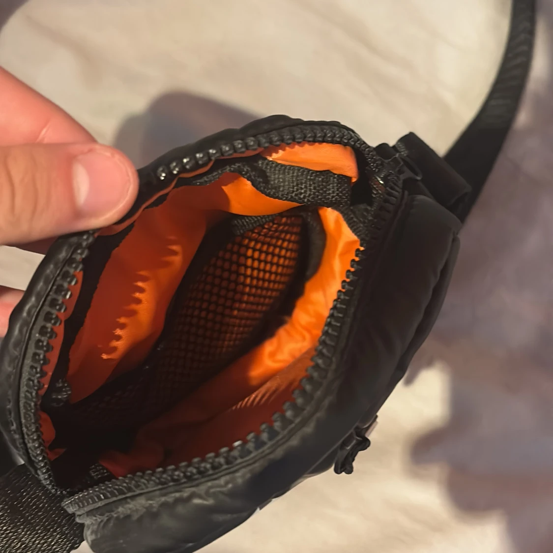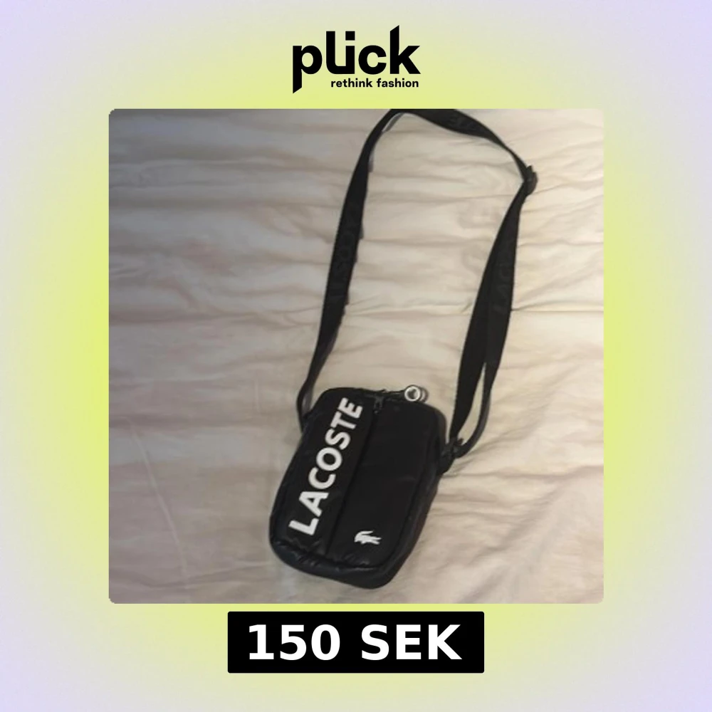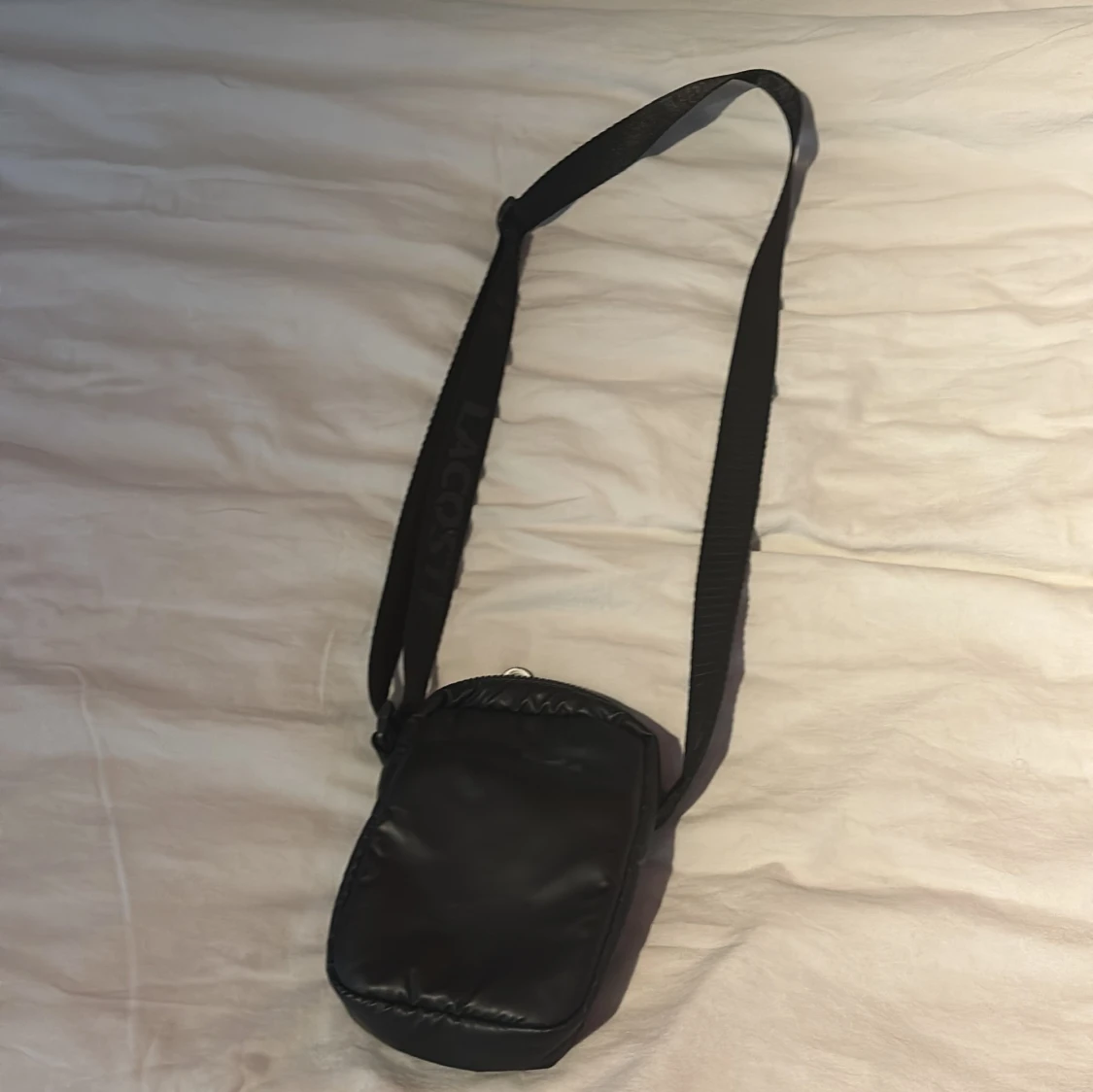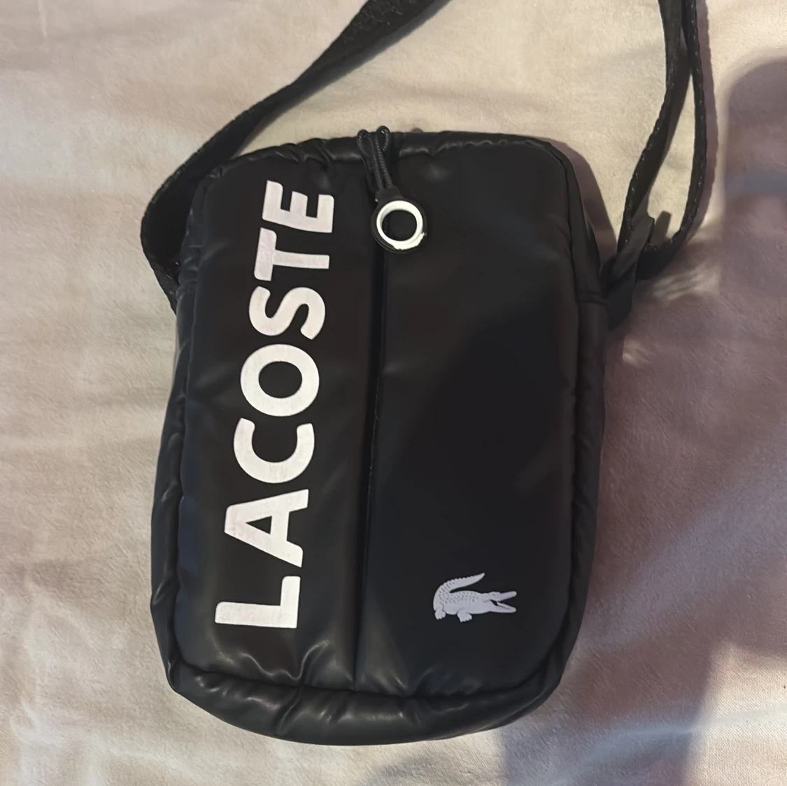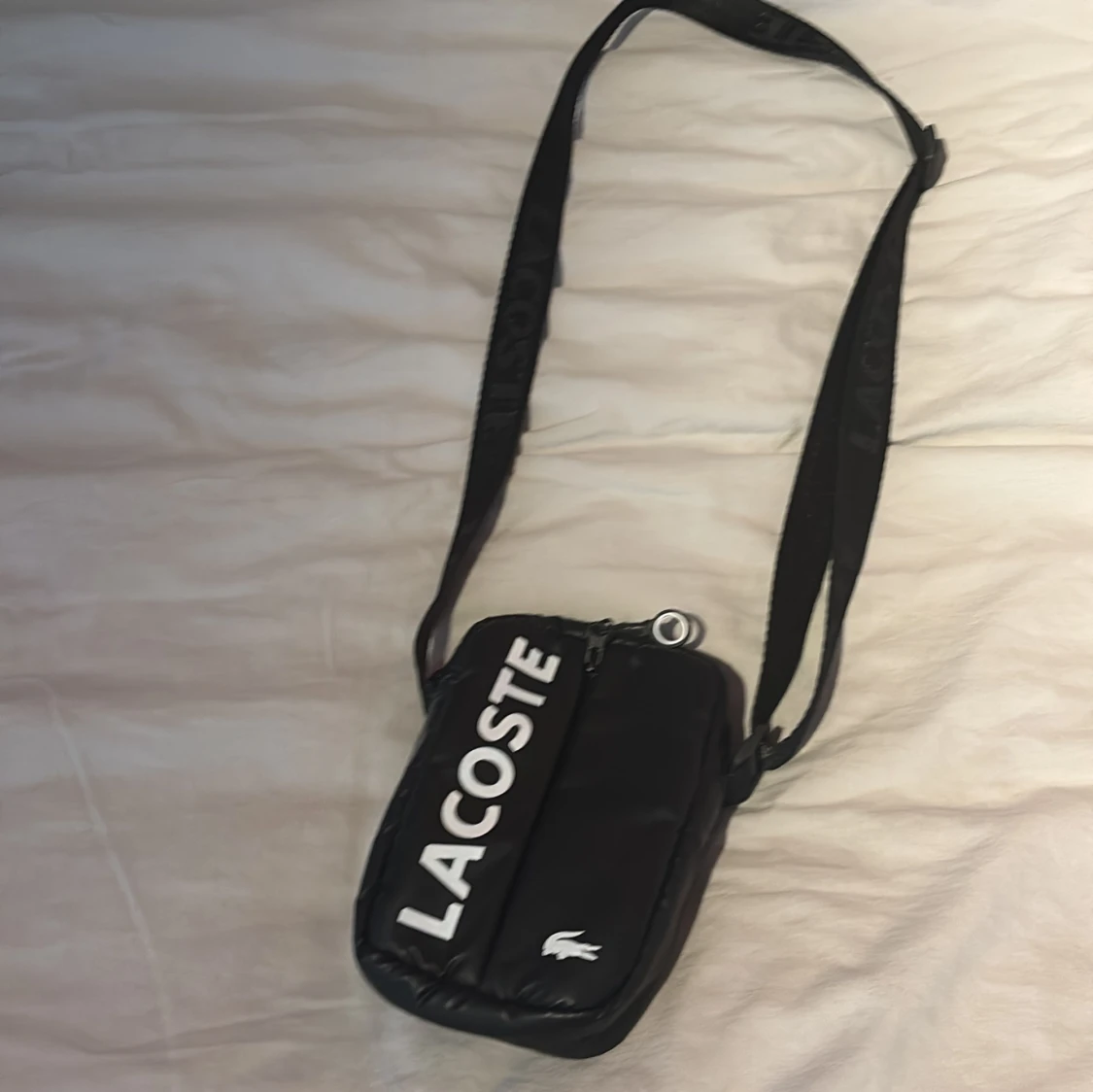 Snygg svart axelväska från Lacoste med vit logga framtill och justerbar rem. Väskan har dragkedja och orange foder på insidan samt meshficka. Perfekt storlek för mobil, plånbok och andra småprylar.