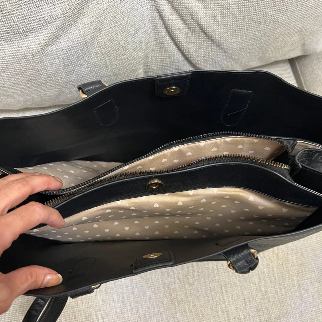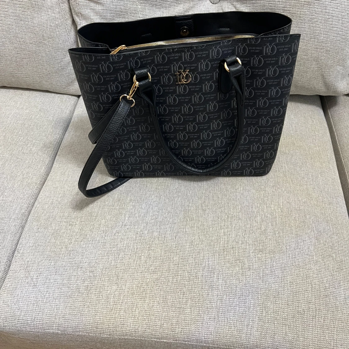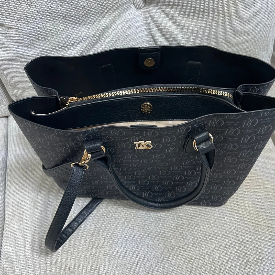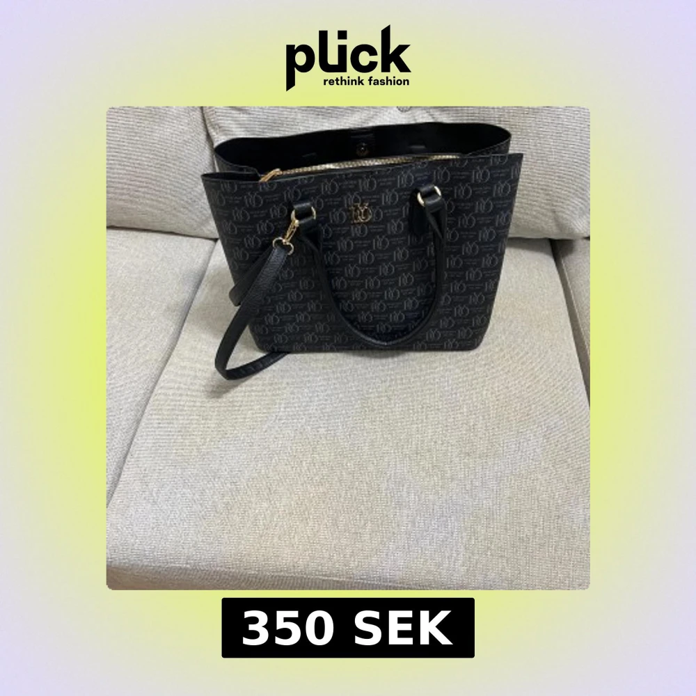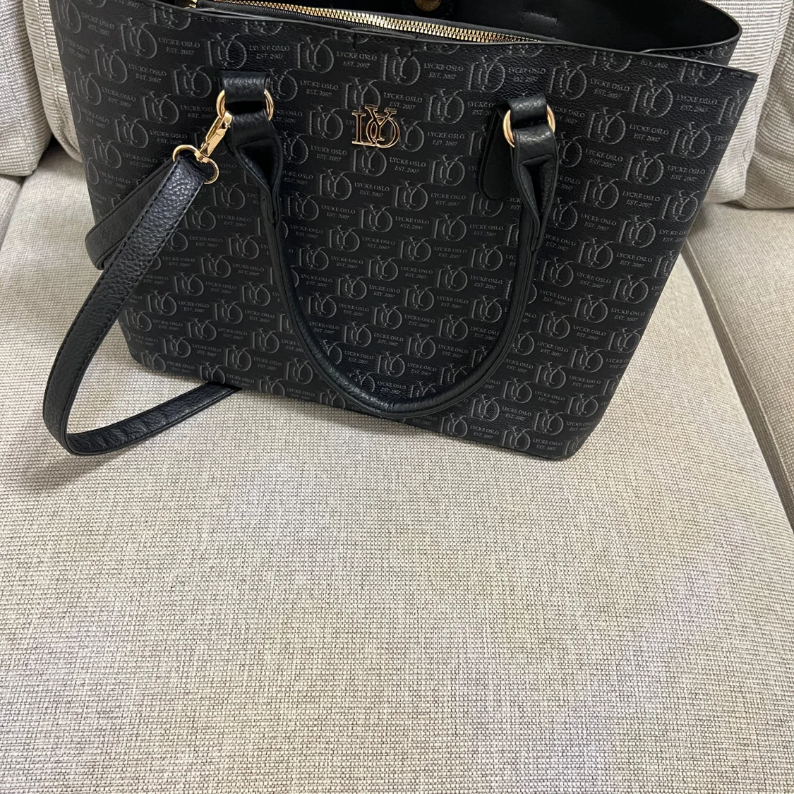 Snygg svart axelväska från Lycke Oslo med guldiga detaljer och logomönster över hela väskan.