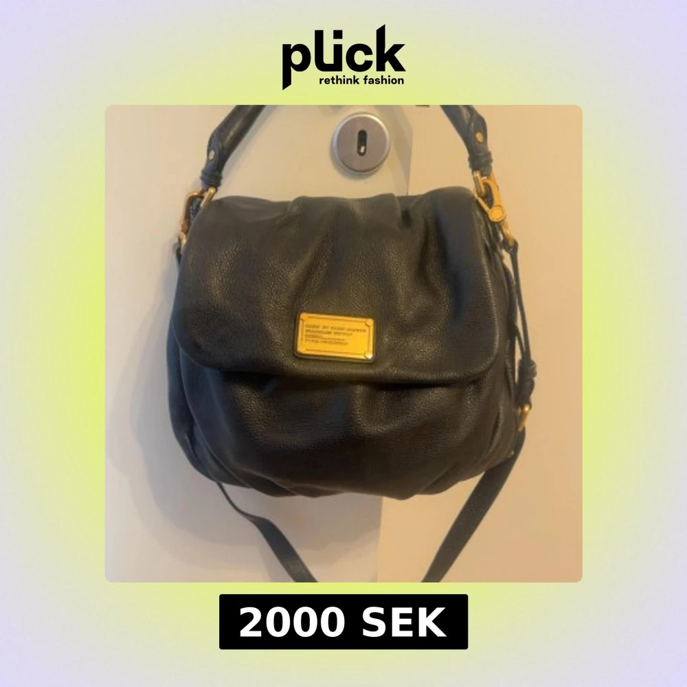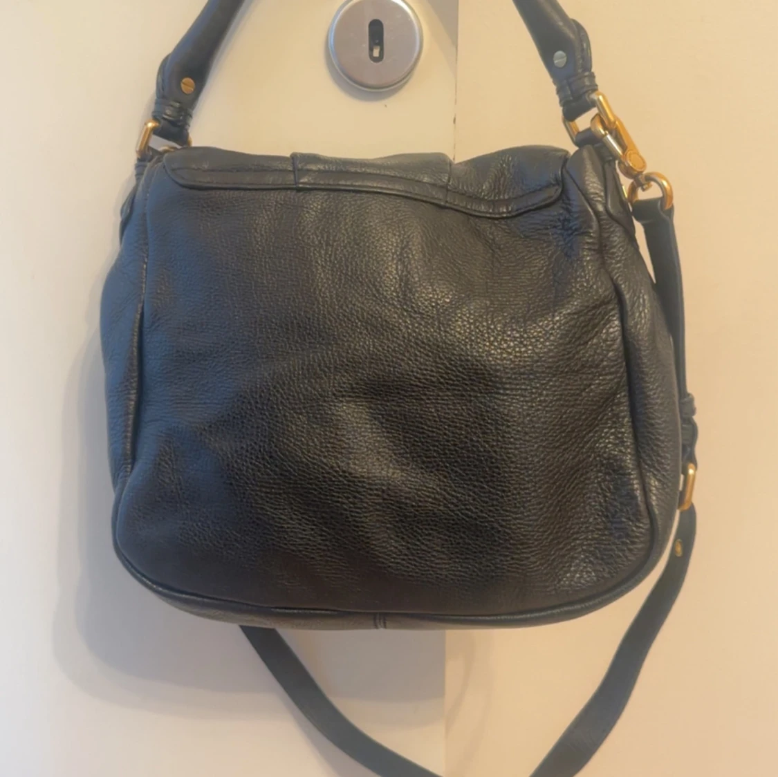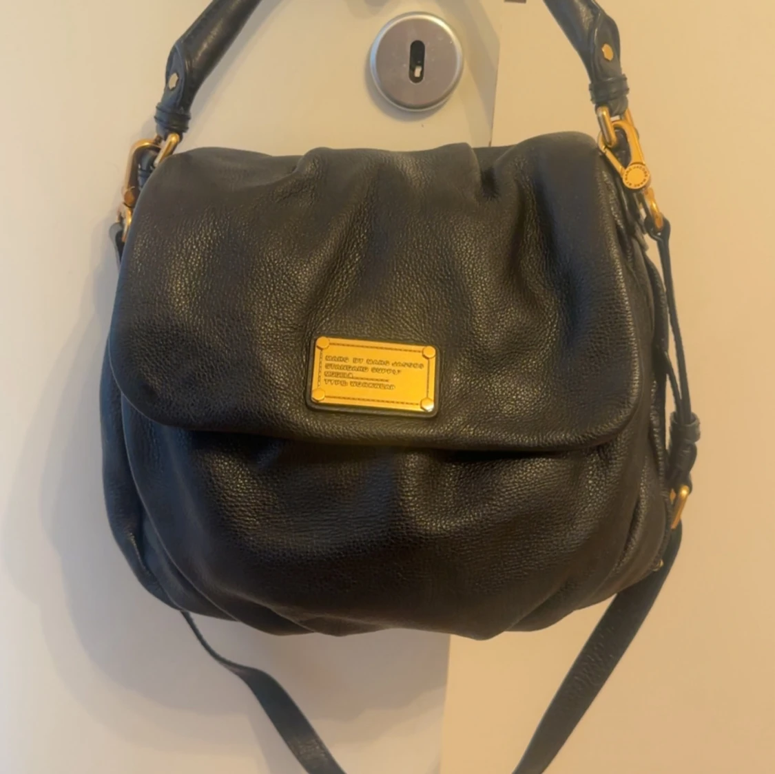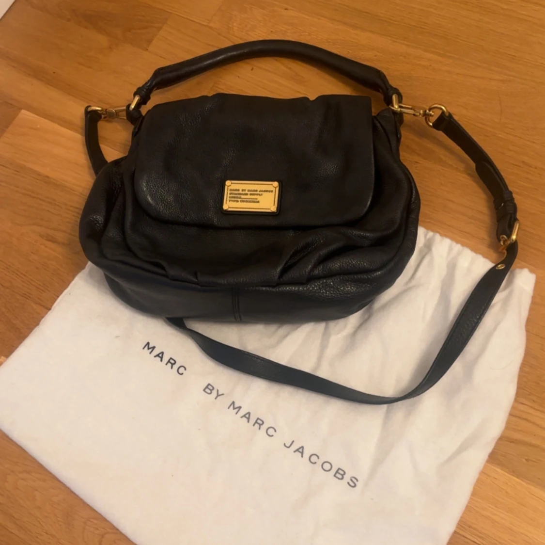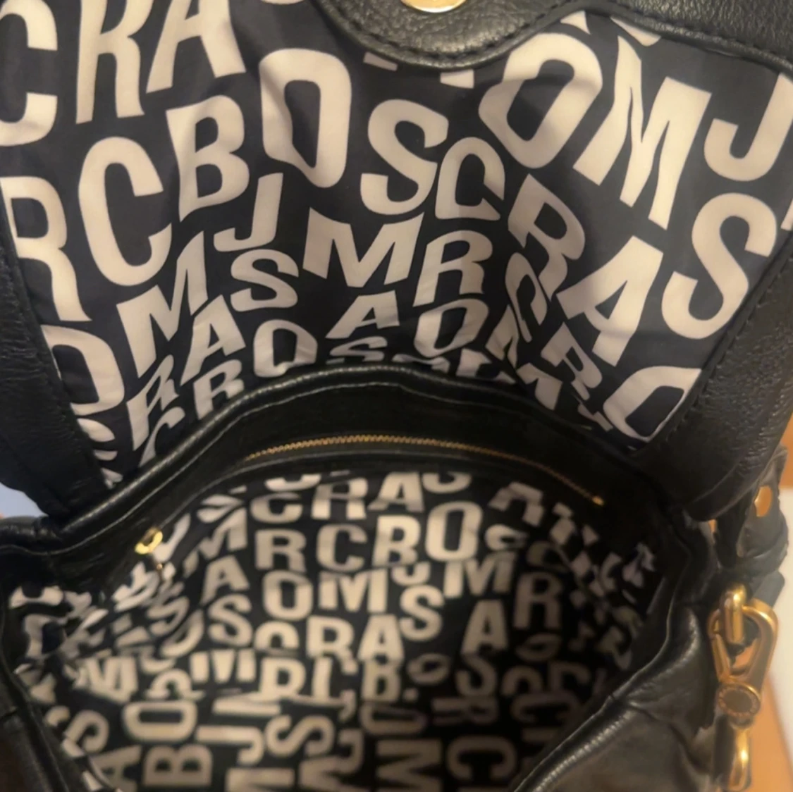 Säljer en svart axelväska från Marc by Marc Jacobs i mjukt skinn med guldfärgade metalldetaljer. Väskan har ett lock med logoplatta framtill och justerbar axelrem. Invändigt foder med grafiskt mönster i svartvitt.