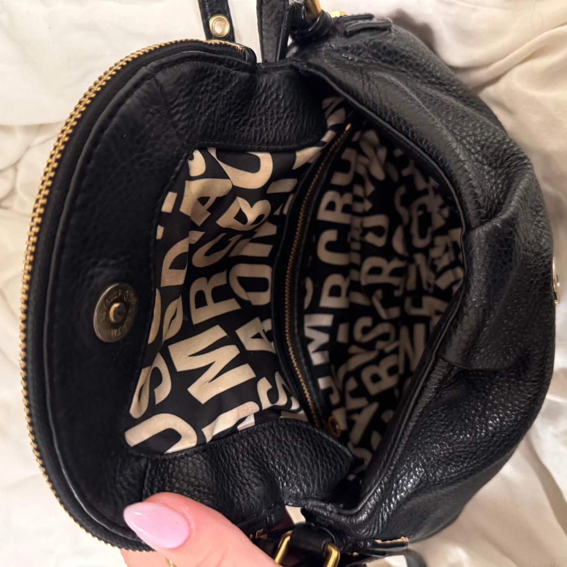 Snygg svart axelväska från Marc Jacobs i äkta skinn med guldfärgade metalldetaljer och dragkedja. Väskan har en rundad form och ett stort fack med coolt mönstrat innerfoder med bokstäver. Perfekt storlek för det viktigaste och har justerbar axelrem.