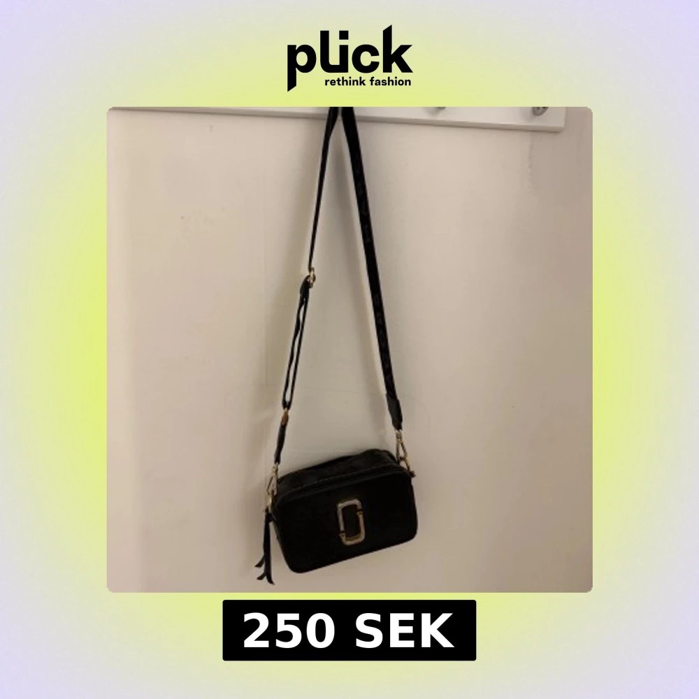 Snygg svart axelväska från Marc Jacobs med justerbart axelband och guldiga metalldetaljer. Väskan har en rektangulär form, dubbla dragkedjor och en ikonisk logga framtill. Perfekt storlek för mobil, plånbok och andra essentials.