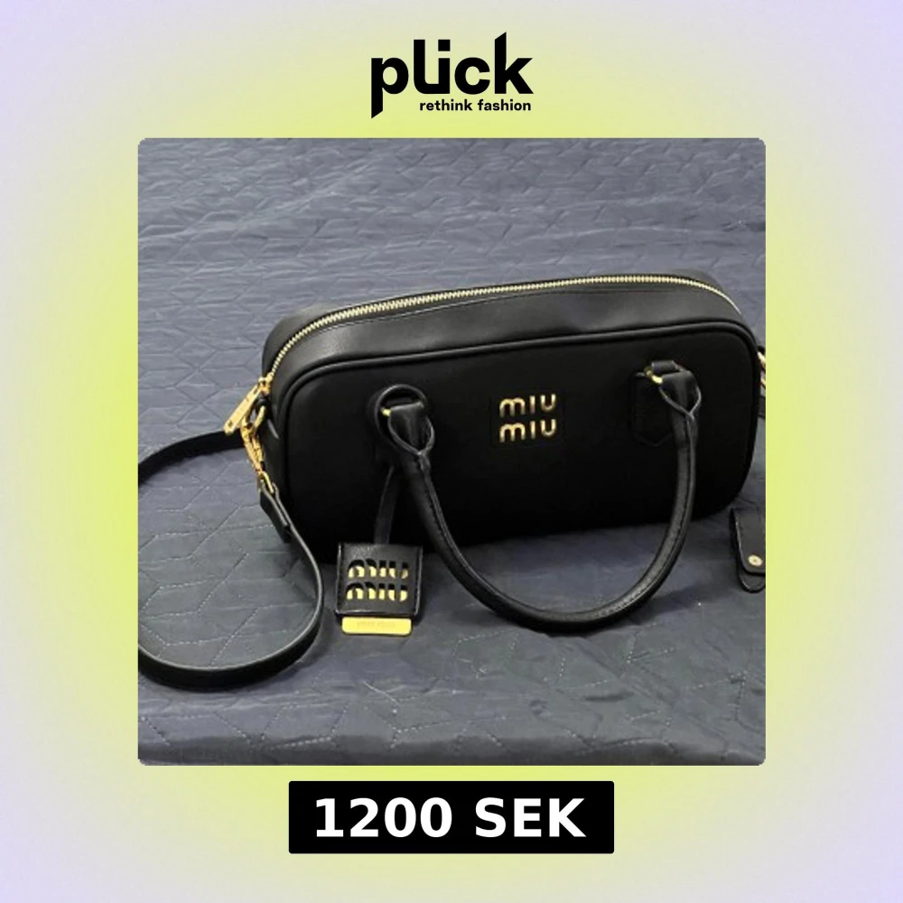 Snygg svart axelväska från Miu Miu i slätt skinn med guldiga metalldetaljer och dragkedja. Väskan har både handtag och justerbar axelrem samt logga framtill. Perfekt storlek för det viktigaste och stilren design som lyfter varje outfit.