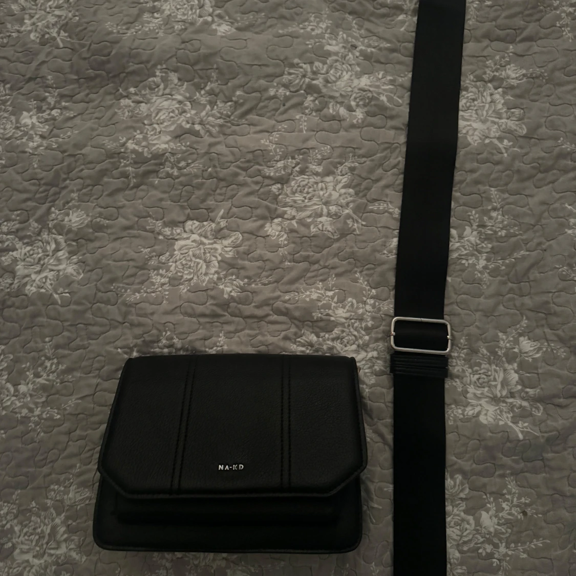 Snygg svart axelväska från NA-KD med stilren design och justerbart brett axelband. Väskan är tillverkad i skinnimitation och har en minimalistisk look med diskret logga framtill. Perfekt för att bära dina viktigaste grejer. Pris kan diskuteras !!