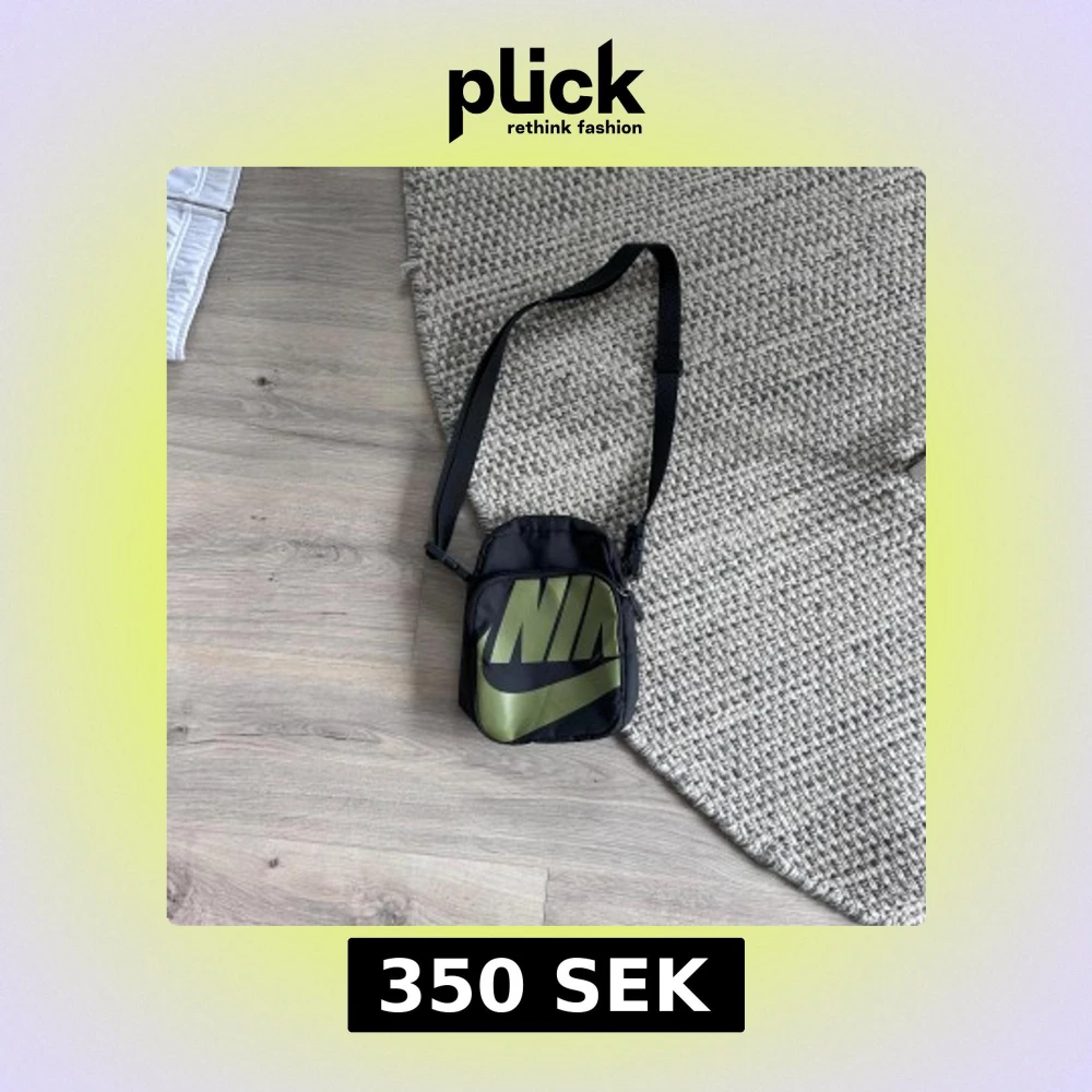 Säljer en svart axelväska från Nike med stort grönt logotryck på framsidan. Väskan har justerbar axelrem och dragkedja upptill. Perfekt för att bära med sig det viktigaste i vardagen.