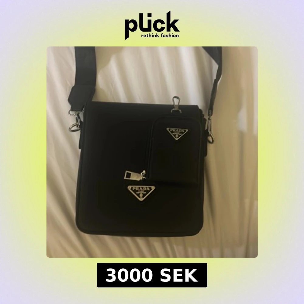 Säljer en svart axelväska från Prada med justerbar rem och silverfärgade detaljer. Väskan har en avtagbar liten ficka framtill med dragkedja och klassiska Prada-loggor i metall. Perfekt för att bära det viktigaste med stil.