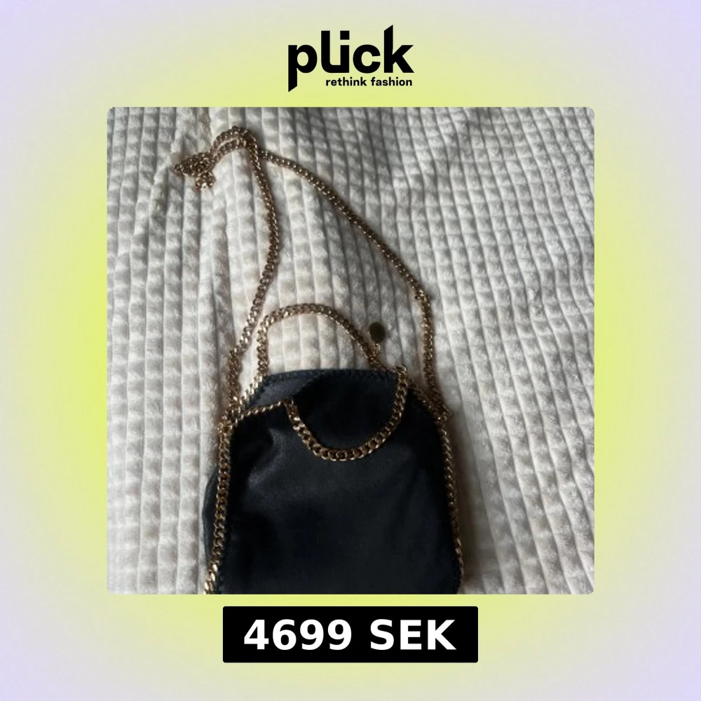 Säljer en svart axelväska från Stella McCartney med kedjedetaljer i guld och matchande axelrem. Väskan har en mjuk insida med logotypmönster och stängs med magnetknapp. Perfekt för dig som vill ha en stilren och trendig accessoar. Den är aldrig använd har köpt den på plick och den var helt ny då.