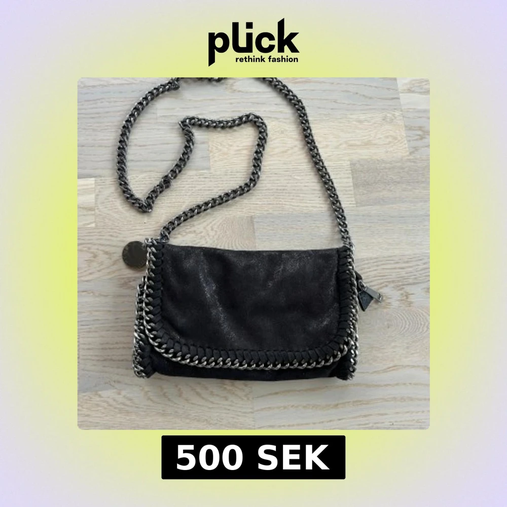 Cool svart axelväska med kedjerem och snygga silverdetaljer från Stella McCartney. Väskan har ett glansigt yttre i syntetmaterial, dekorativa kedjor runt kanterna och magnetlås. Insidan har ett fack med dragkedja för småsaker.
