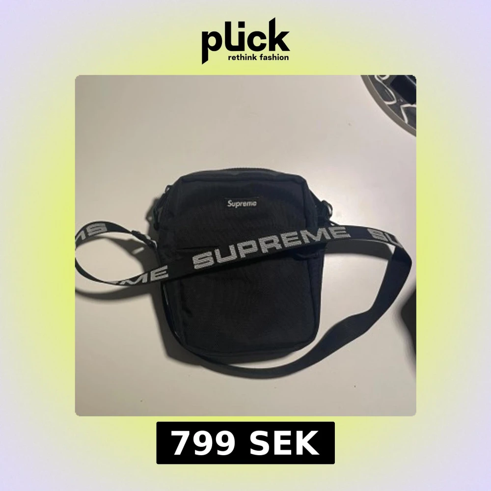 Säljer en stilren svart axelväska från Supreme. Väskan har en justerbar axelrem med Supreme-loggan och en praktisk dragkedja upptill. Perfekt för att bära med sig det nödvändigaste med stil.