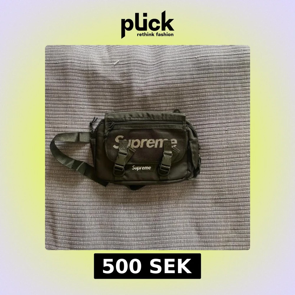 Säljer en svart slingbag från Supreme med justerbar rem och flera fack. Väskan har två spännen framtill, dragkedja och Supreme-logga på framsidan. Perfekt för att bära med sig lätta mängder med saker, har även plats för vissa större saker. Priset ej hugget i sten. Aldrig använd.