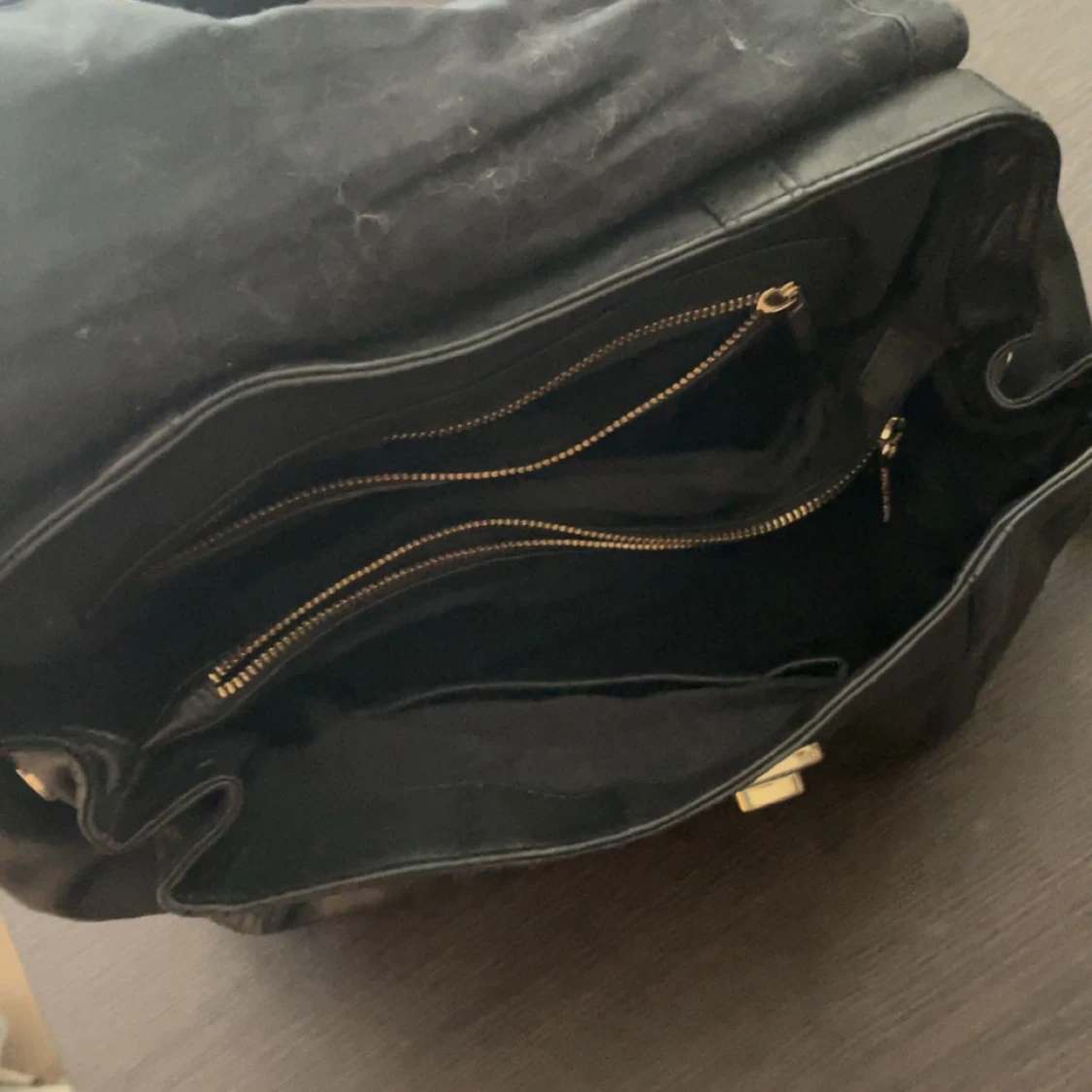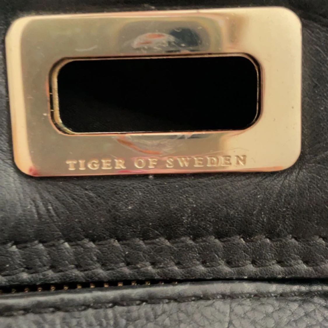 Snygg svart axelväska i skinn från Tiger of Sweden med guldfärgade metalldetaljer. Väskan har lock med spänne, flera innerfack med dragkedja och både axelrem och handtag. Perfekt för dig som vill ha en stilren och rymlig väska med exklusiv känsla.