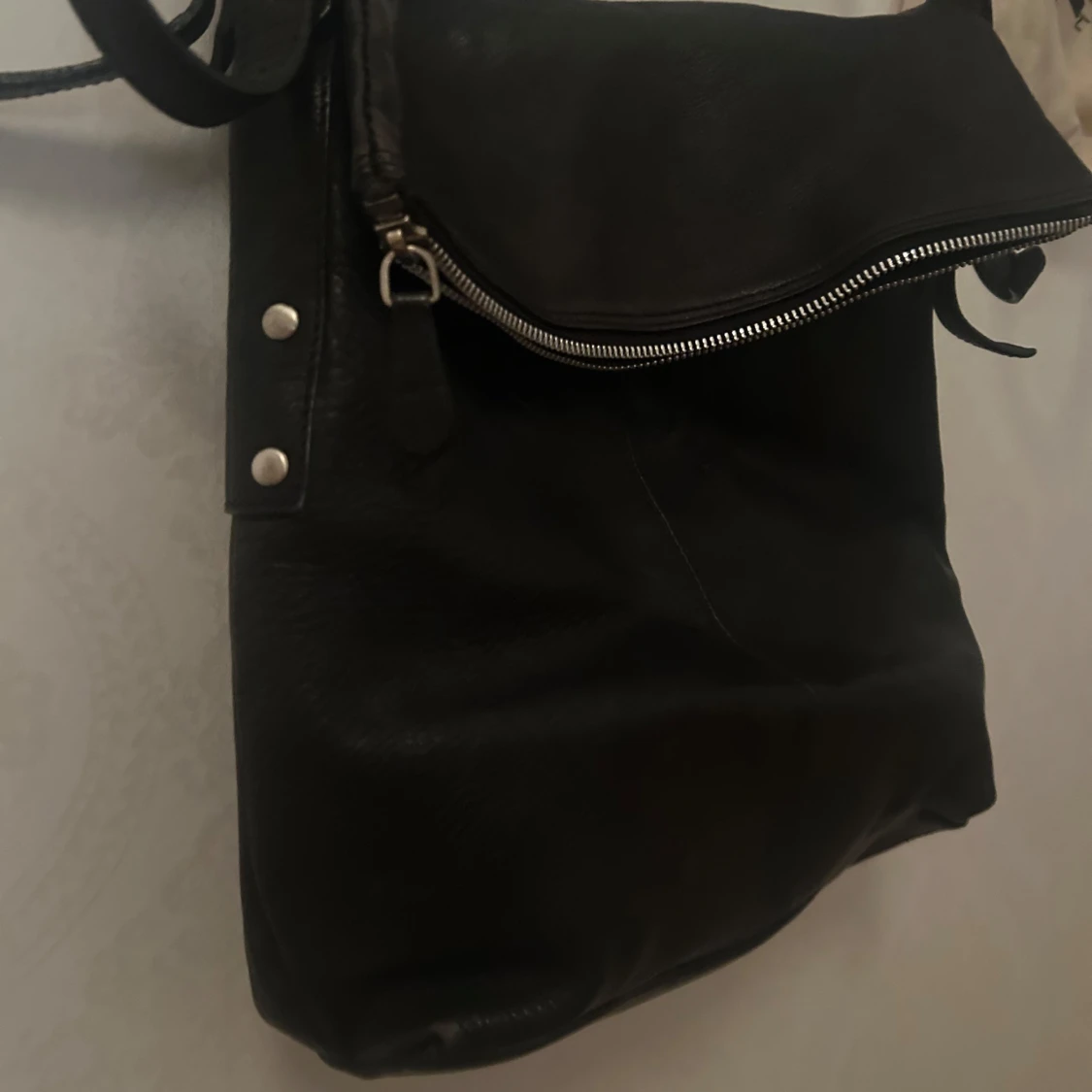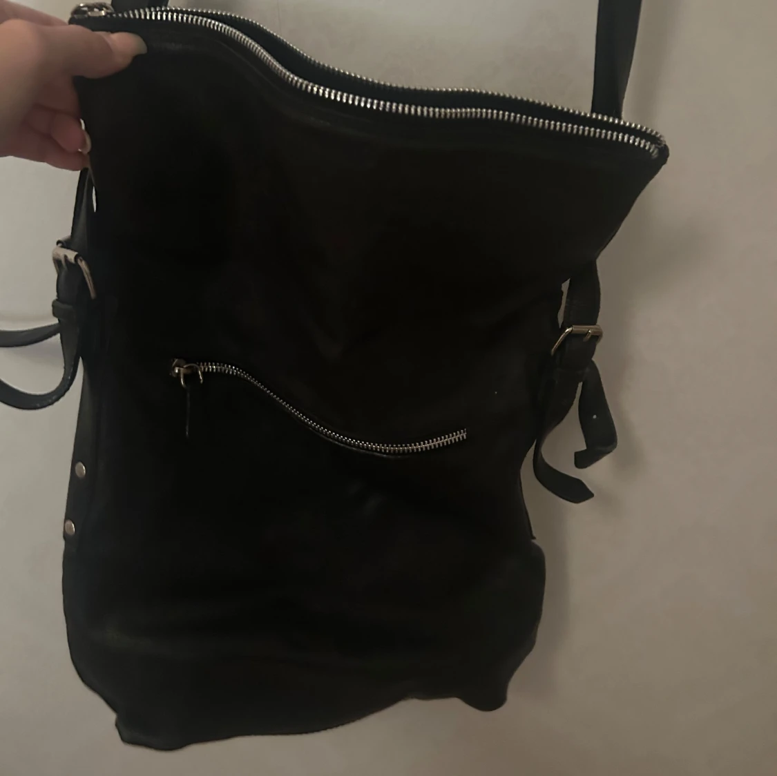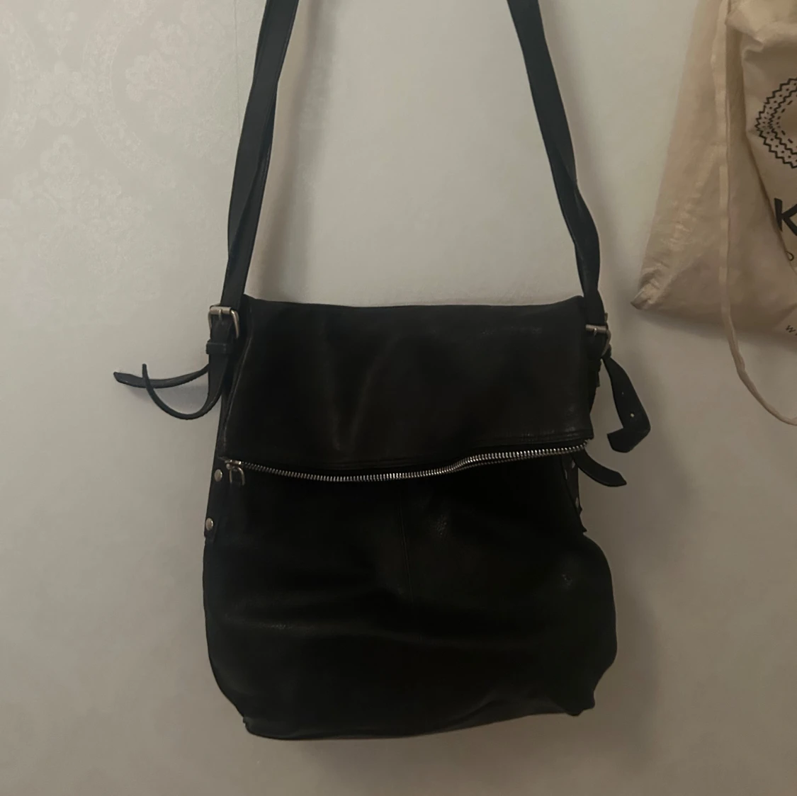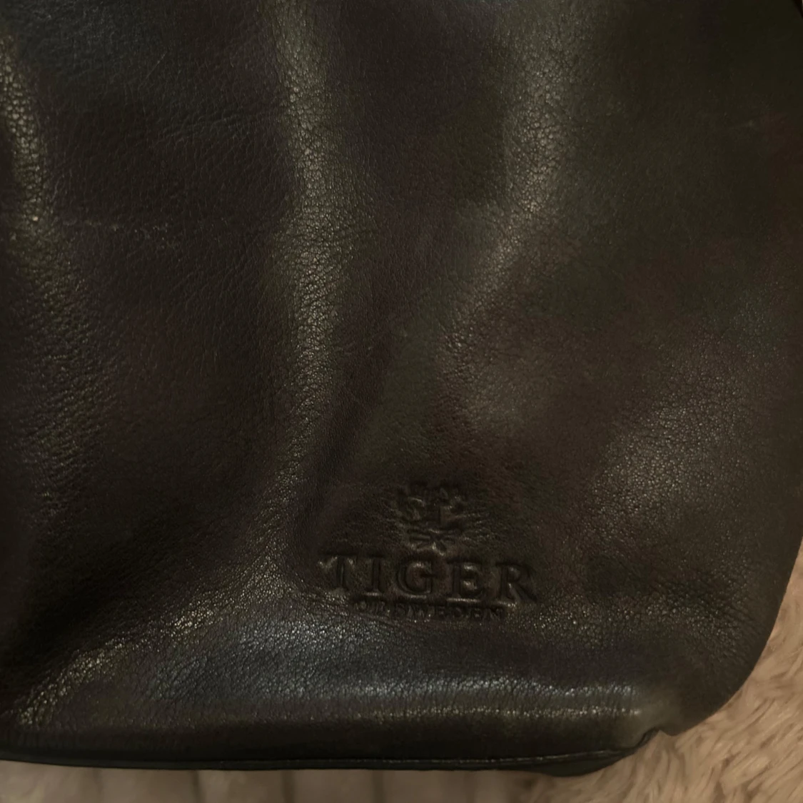 Snygg svart axelväska i skinn från Tiger of Sweden. Väskan har en mjuk, slouchy form med silverfärgade dragkedjor och nitar på sidan. Justerbar axelrem och praktiska fack gör den perfekt för dig som vill ha både stil och funktion.