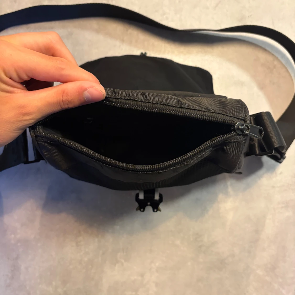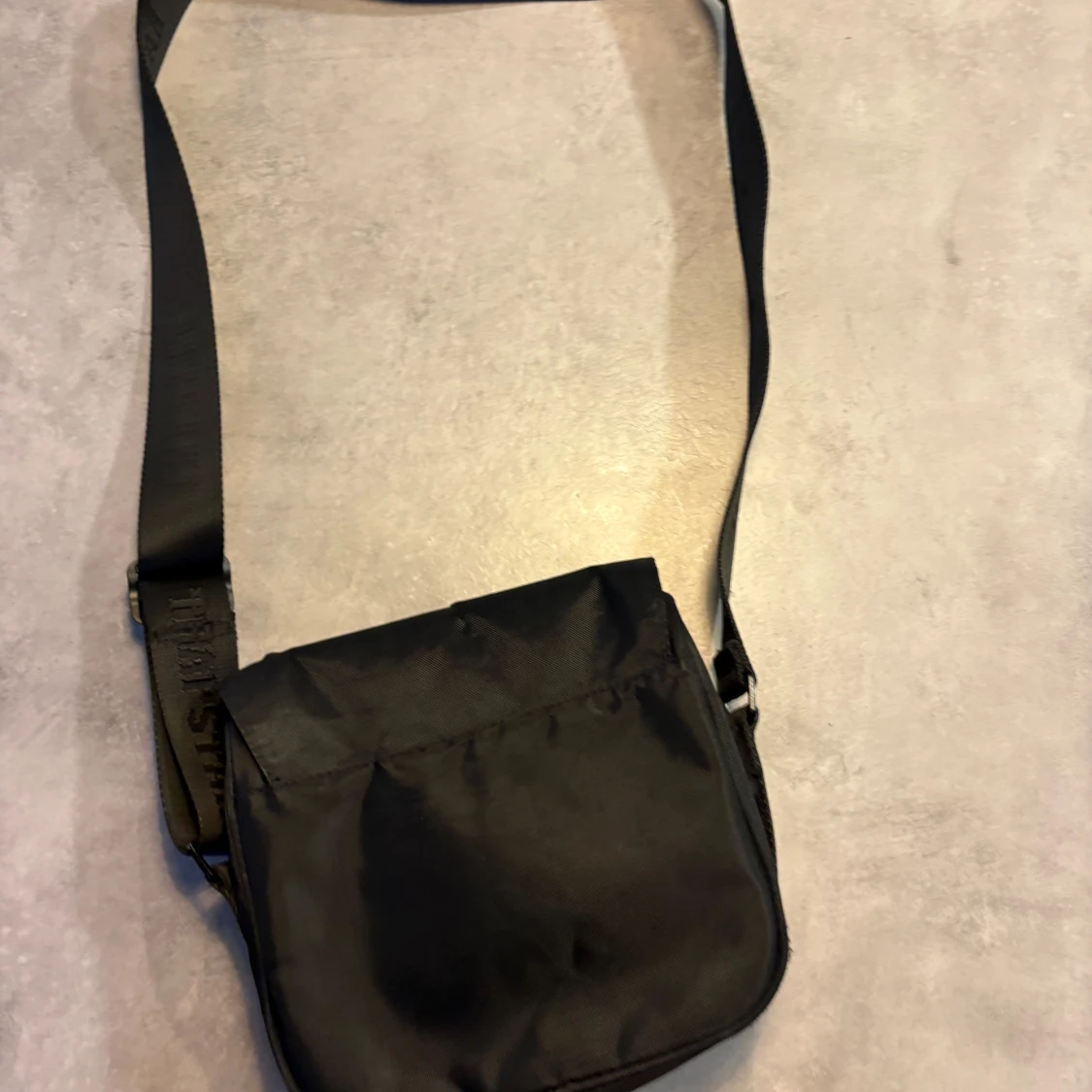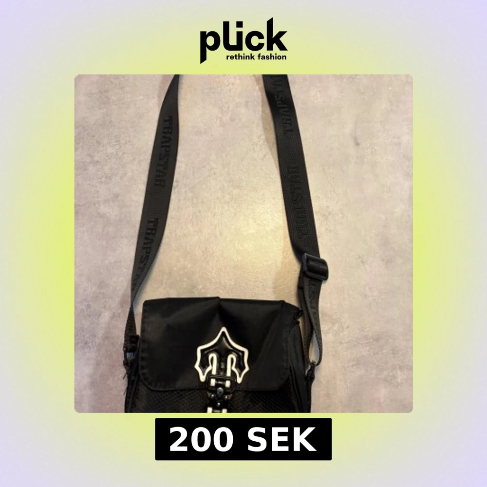 Säljer en svart axelväska från Trapstar med justerbart band där loggan är invävd. Väskan har lock med unik vit och svart detalj framtill, spänne och dragkedja. Materialet är slitstark polyester med diskret mönstrad framsida. Perfekt för att bära det viktigaste.