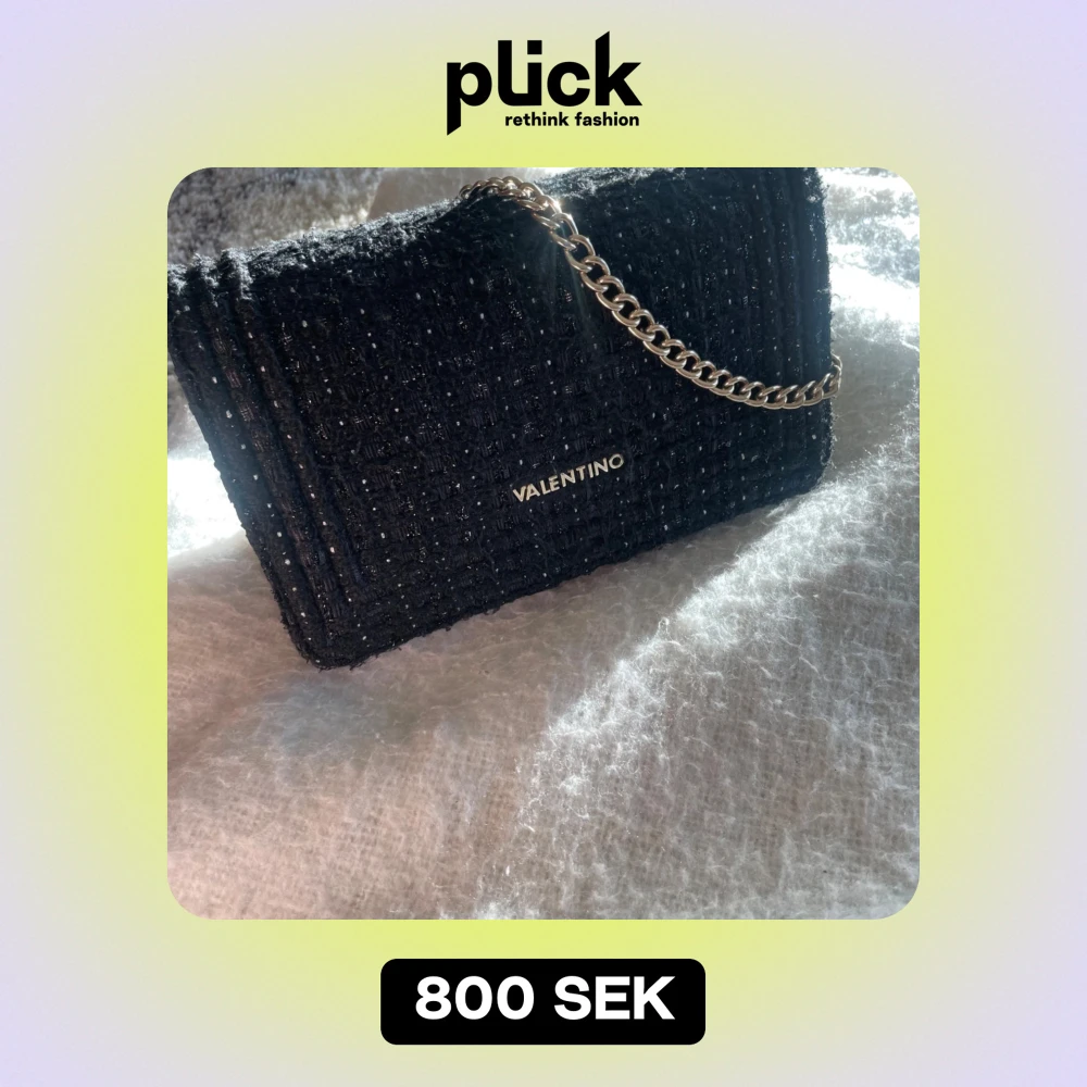Elegant svart axelväska från Valentino med en stilren kedjerem. Väskan har en glittrig yta och ett diskret mönster. Perfekt för att ge en touch av glamour till din outfit eller en julklapp/present till dig eller någon du tycker om.