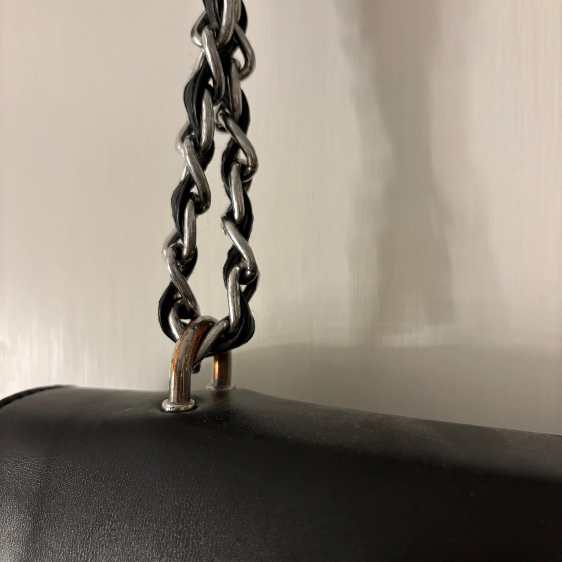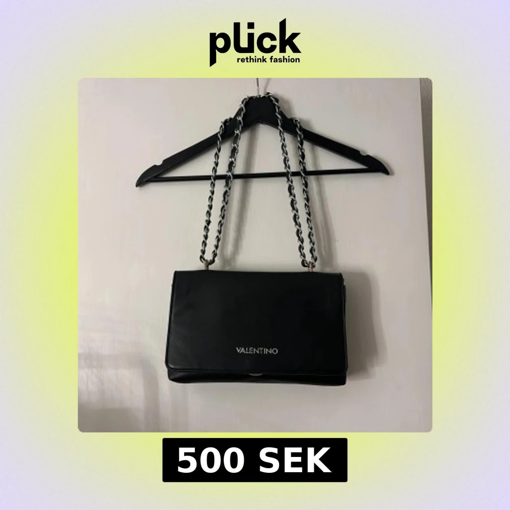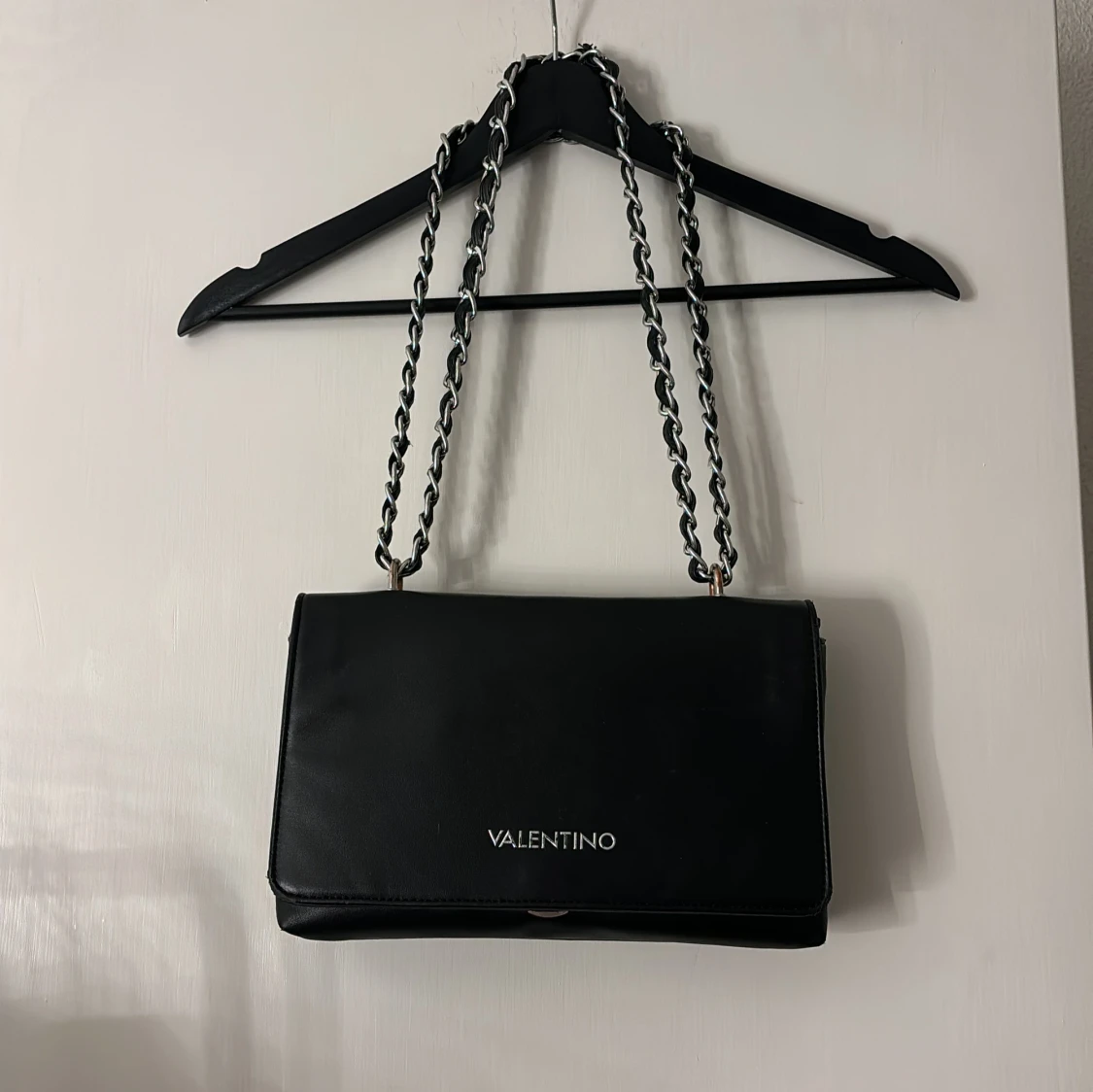 Snygg svart axelväska från Valentino med kedjedetaljer på axelremmen. Väskan har en stilren design med logotyp framtill. Perfekt för att ge en elegant touch till din outfit.