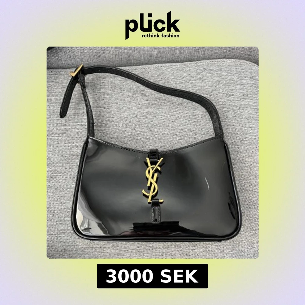 Säljer en elegant svart axelväska från Yves Saint Laurent i glansigt material med guldigt YSL-emblem framtill. Väskan har justerbart axelband och klassisk design, perfekt för att lyfta vilken outfit som helst. Priset kan diskuteras