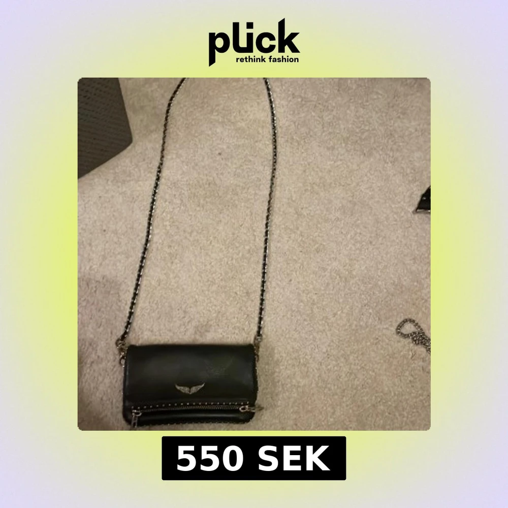 Snygg svart axelväska i skinn från Zadig & Voltaire med kedjerem och coola nitar. Väskan har en dragkedja och ett stilrent emblem med vingar på framsidan. Perfekt för att ge din outfit en edgy touch! På de två sista bilderna ser man att den tappat lite färg men syns bara på nära håll! Därav priset , ny pris 2500.
