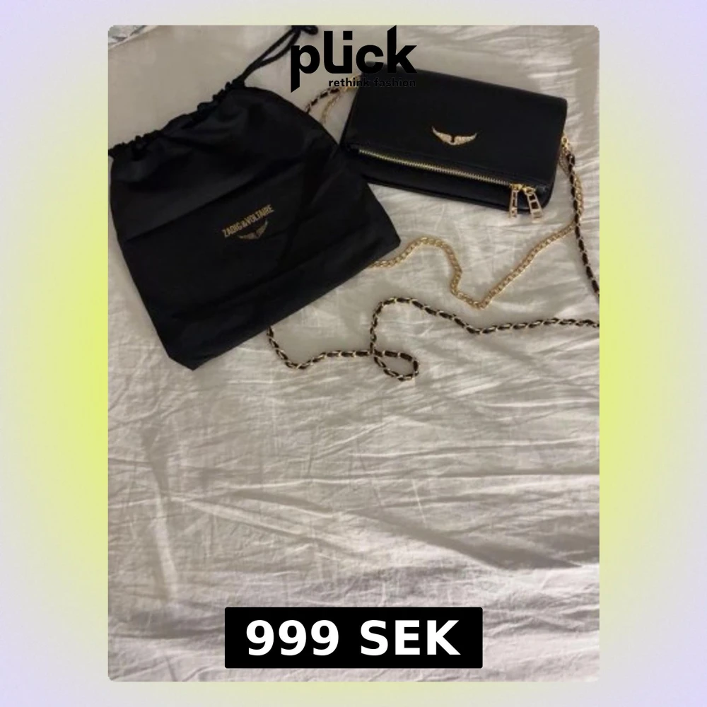 Snygg svart axelväska i skinn från Zadig & Voltaire med guldfärgad kedjerem och detaljer. Väskan har dragkedja både fram och bak samt ikonisk vinglogga i guld på framsidan. Perfekt storlek för det viktigaste och ger en cool vibe till din outfit.