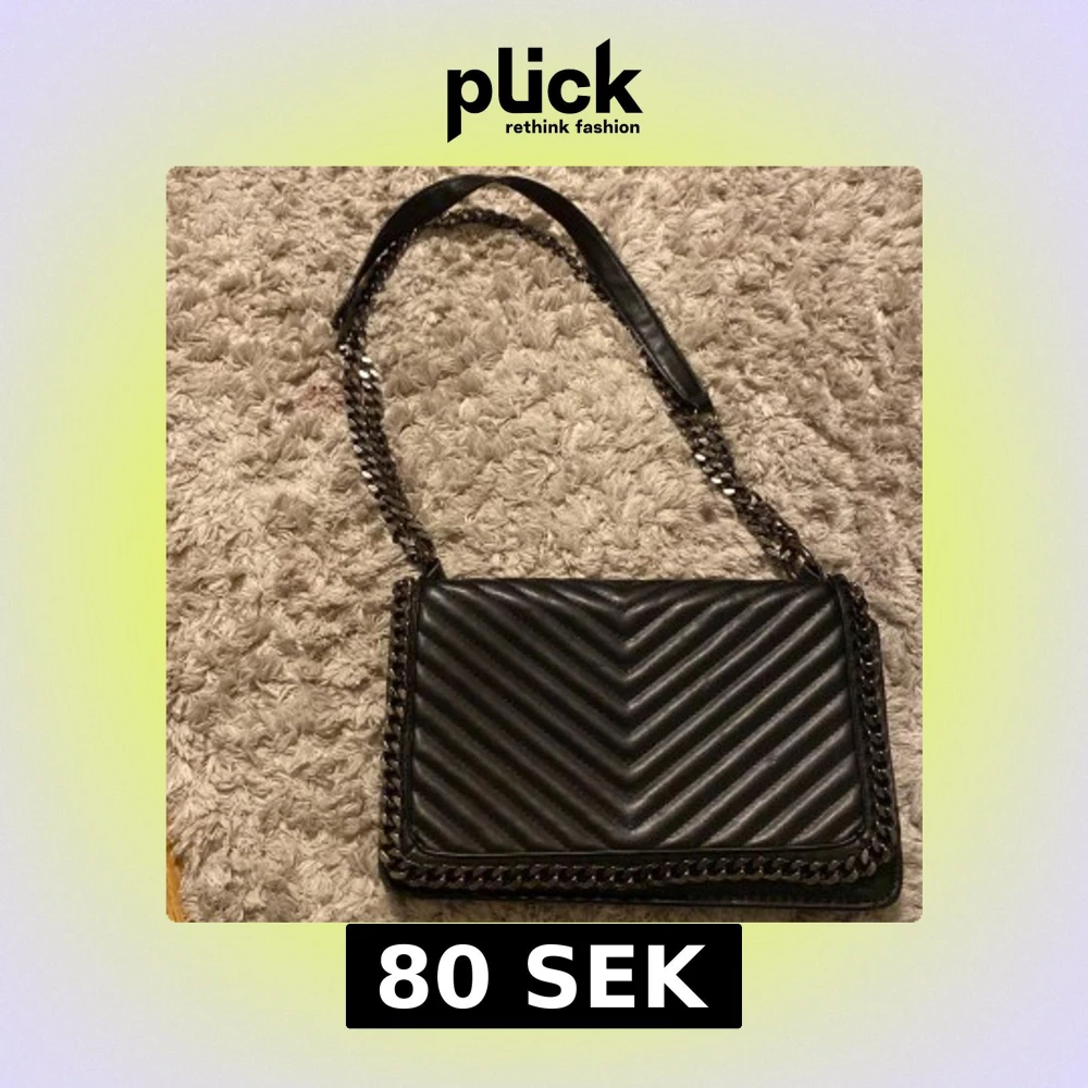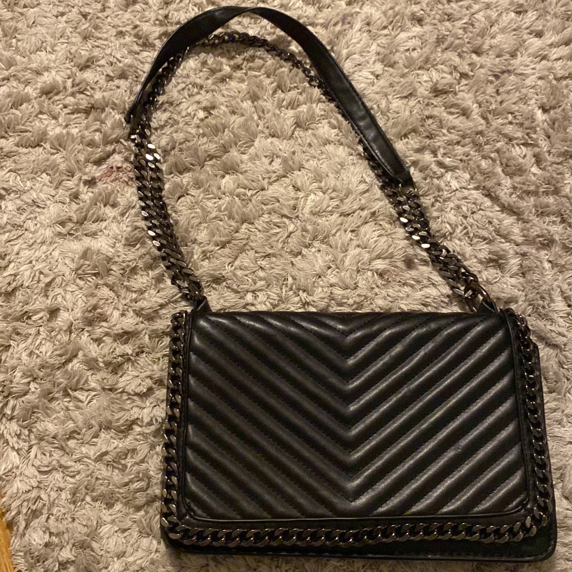 Snygg svart axelväska från Gina Tricot med quiltad design i chevronmönster. Väskan har en kedjerem med läderdetalj upptill och metallkedja runt kanterna för en edgy look. Perfekt storlek för det viktigaste och stängs med lock.