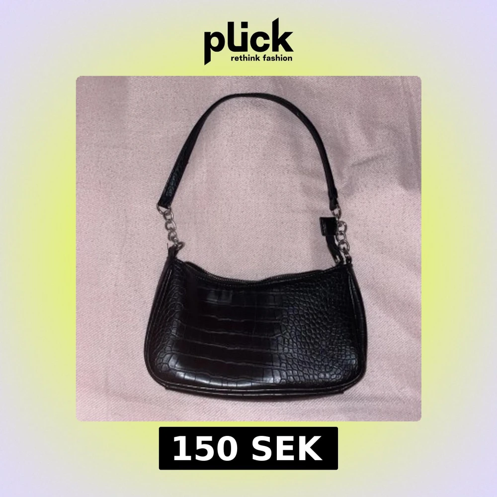 Snygg svart axelväska från H&M med croco-mönstrad yta och silvriga metalldetaljer. Väskan har dragkedja upptill och ett rymligt fack inuti. Perfekt storlek för det viktigaste och ger en trendig vibe till din outfit.