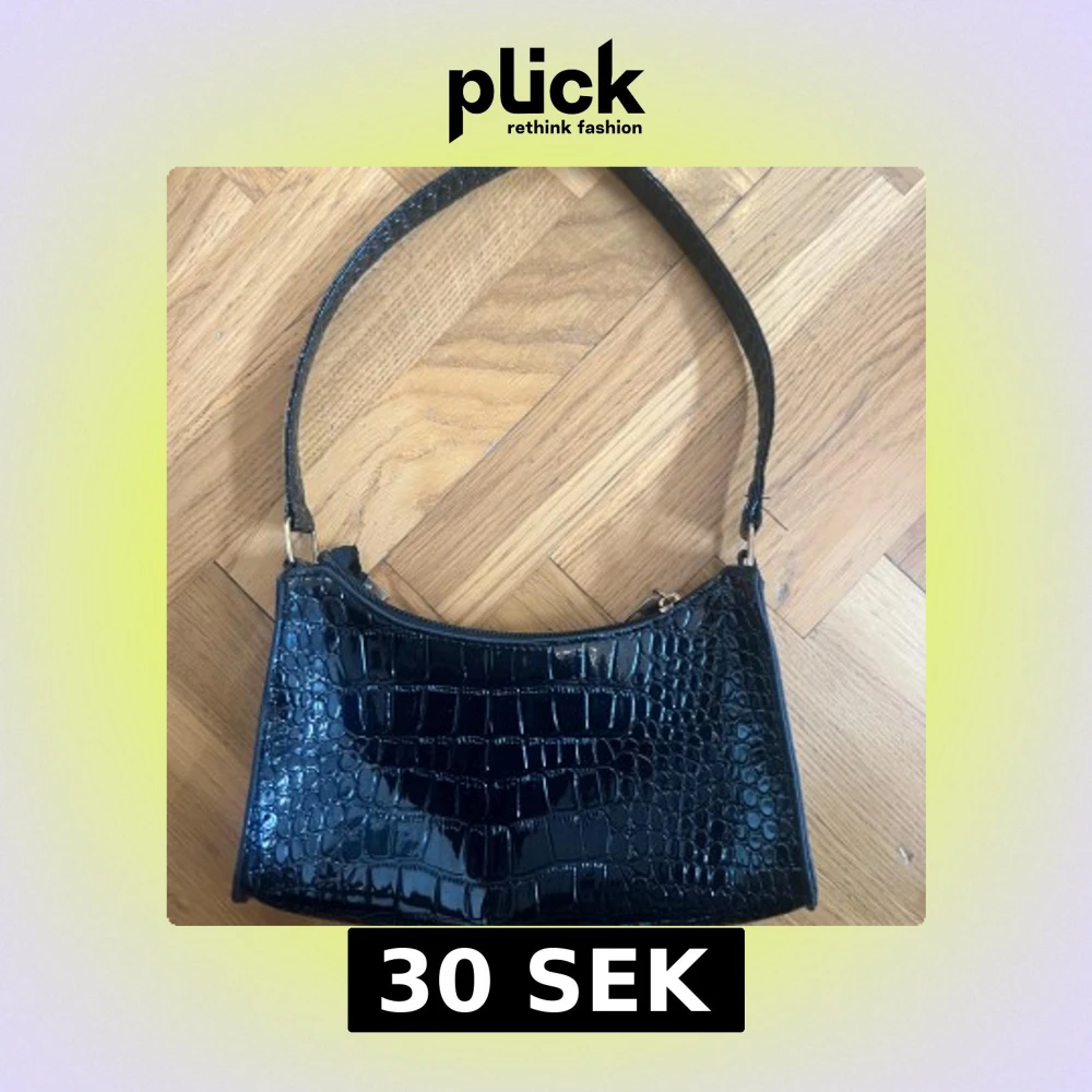 Säljer en svart axelväska med croco-mönstrad yta och glansig finish. Väskan har en klassisk rektangulär form, dragkedja upptill och bred axelrem. Perfekt storlek för det viktigaste och ger en cool vibe till din outfit.