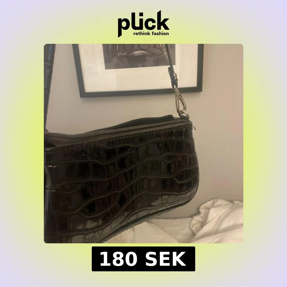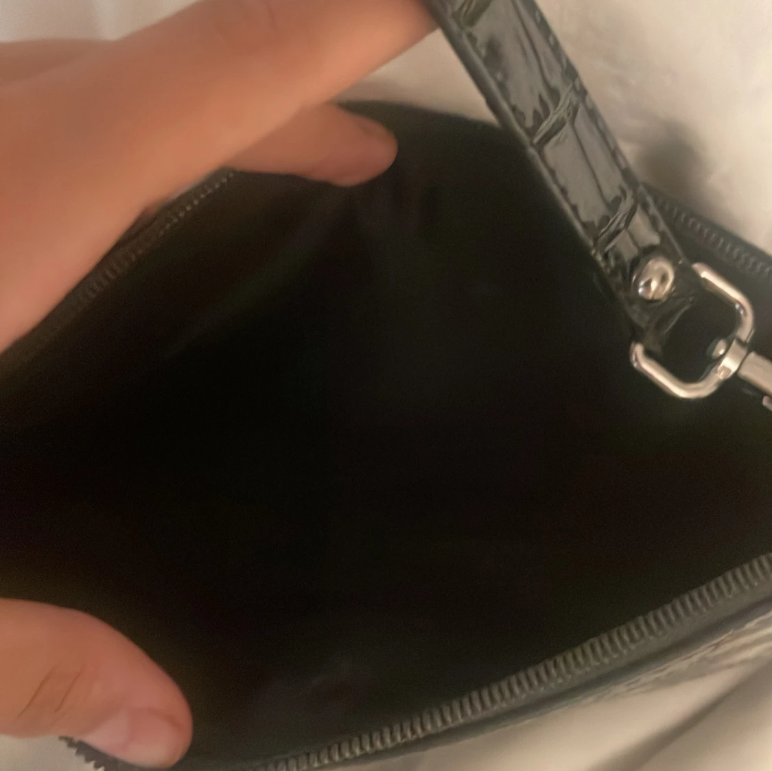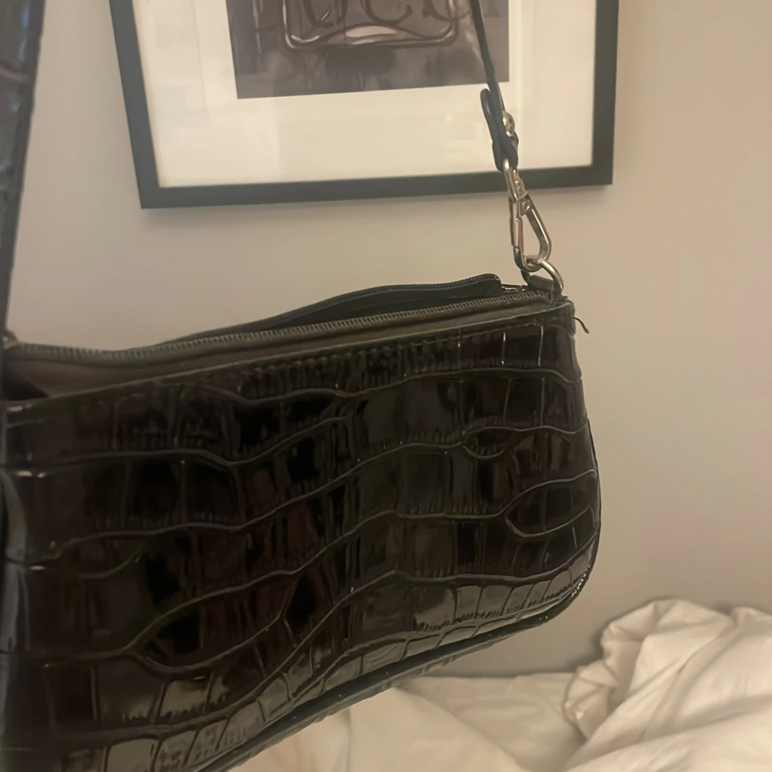 Snygg svart axelväska med crocopräglat mönster och glansig finish. Väskan har dragkedja upptill och avtagbar axelrem med silvriga metalldetaljer. Perfekt storlek för det viktigaste och ger en cool vibe till din outfit.