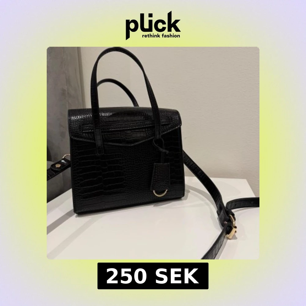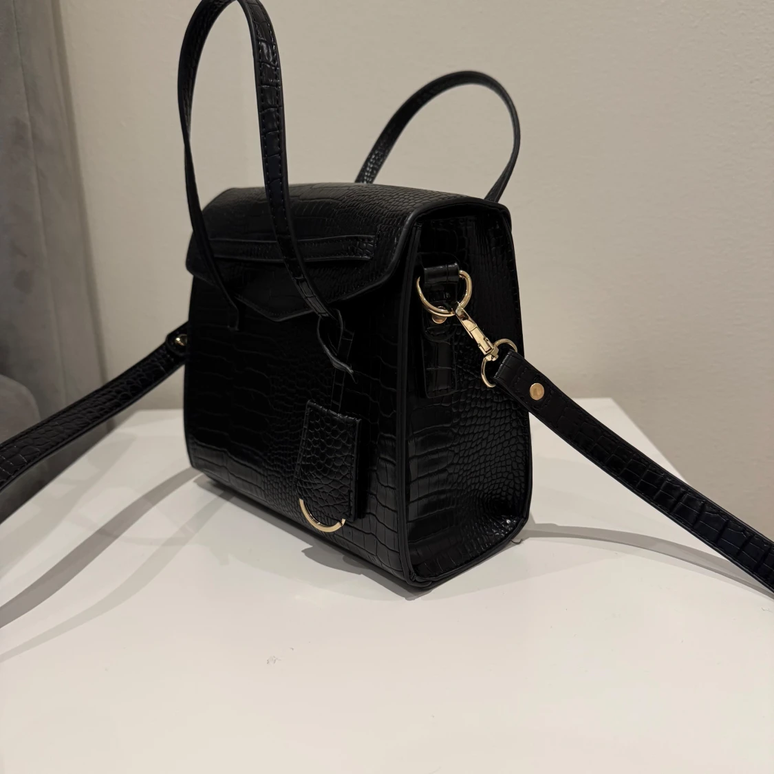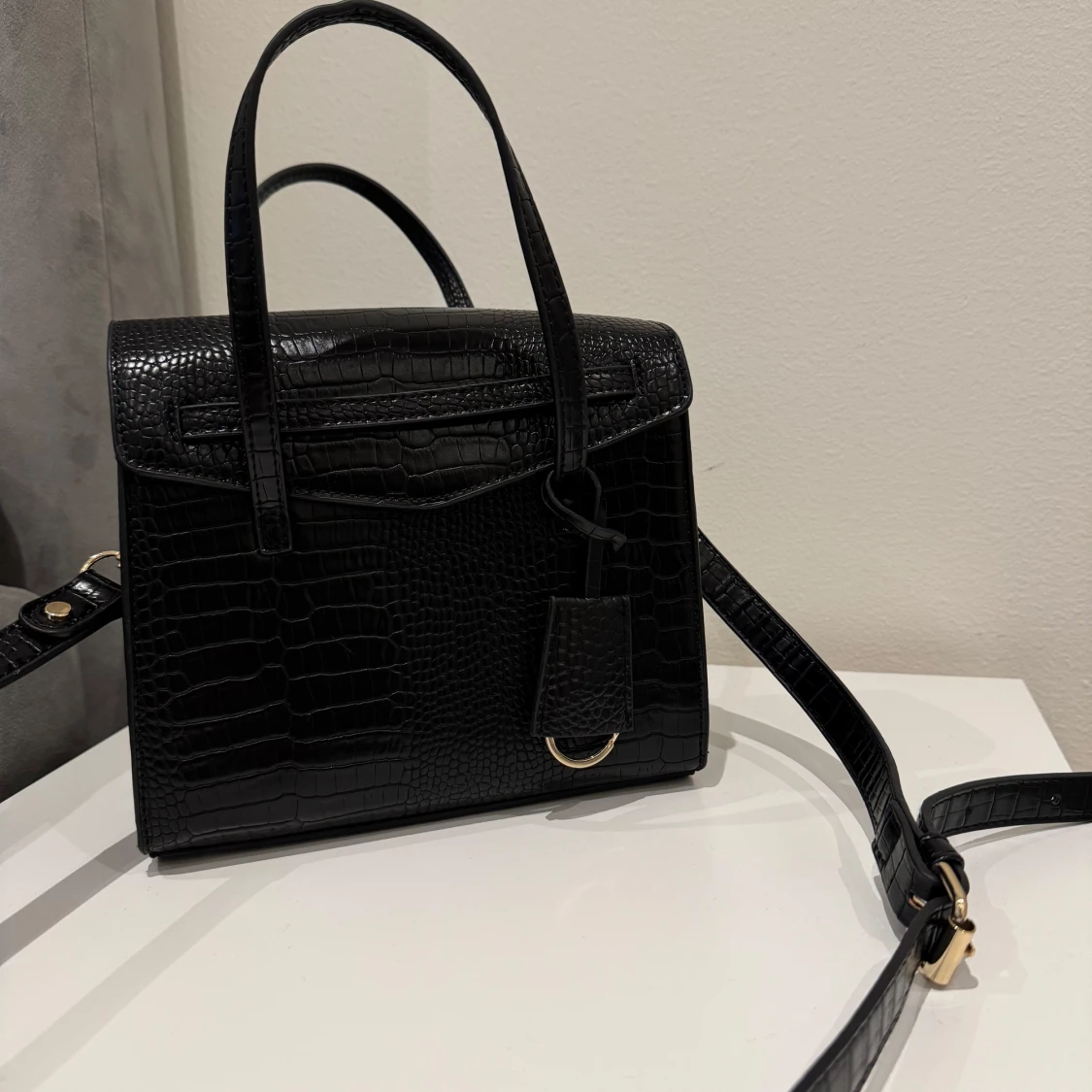 Snygg svart axelväska i krokopräglat skinn med både handtag och justerbar axelrem. Väskan har guldfärgade metalldetaljer och en stilren, fyrkantig form. Perfekt för att lyfta din outfit med en trendig accessoar. Helt ny utan prislapp! Aldrig använt. 🥰