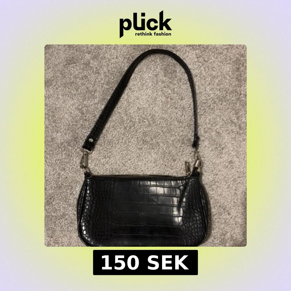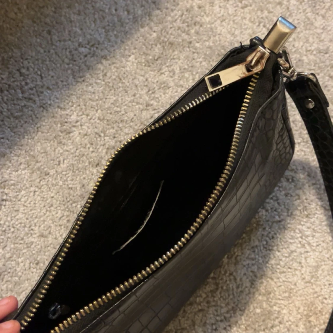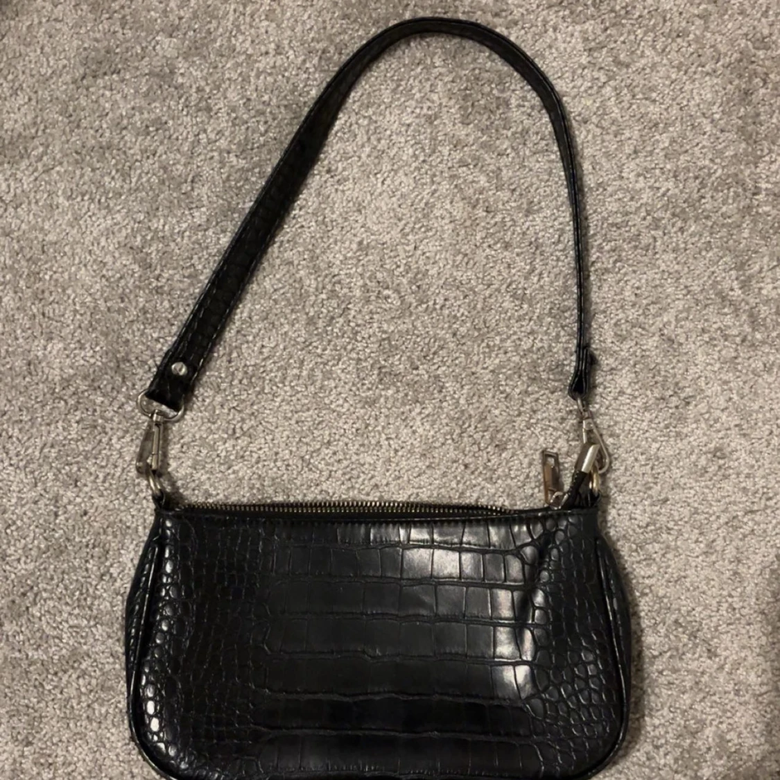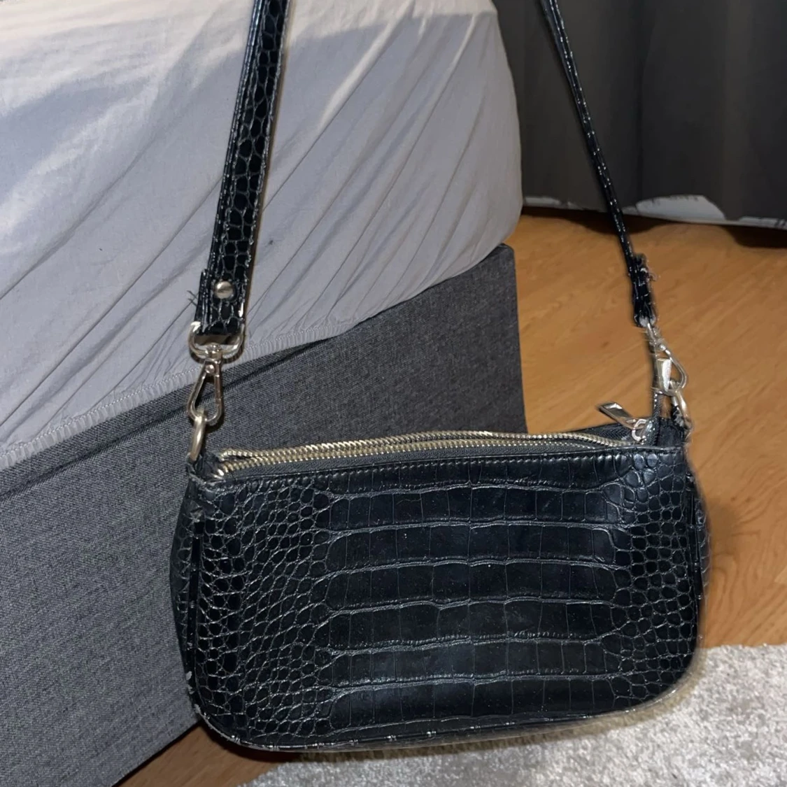 Snygg svart axelväska med krokodilpräglat mönster och dragkedja upptill. Väskan har en avtagbar axelrem och är perfekt för att bära det viktigaste. Stilren och trendig design som passar till många outfits.