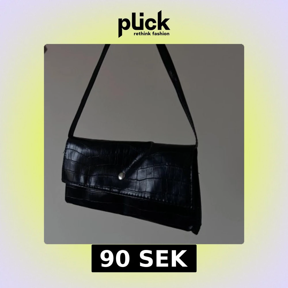 Stilren svart axelväska med krokopräglat mönster och silverfärgad knappstängning. Väskan har en avlång form och justerbar axelrem. Tillverkad i syntetmaterial med skinnlook, perfekt för dig som gillar trendiga accessoarer.