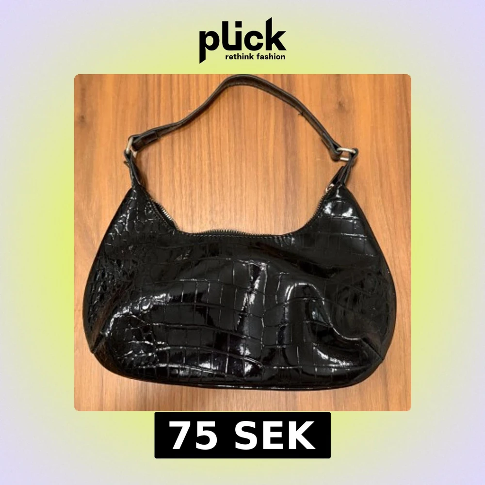 Snygg svart axelväska med krokopräglat mönster och glansig finish. Väskan har en klassisk form, silverfärgad dragkedja och justerbart axelband. Perfekt för dig som vill ha en trendig och stilren accessoar med lite edge. Finns täcken på användning