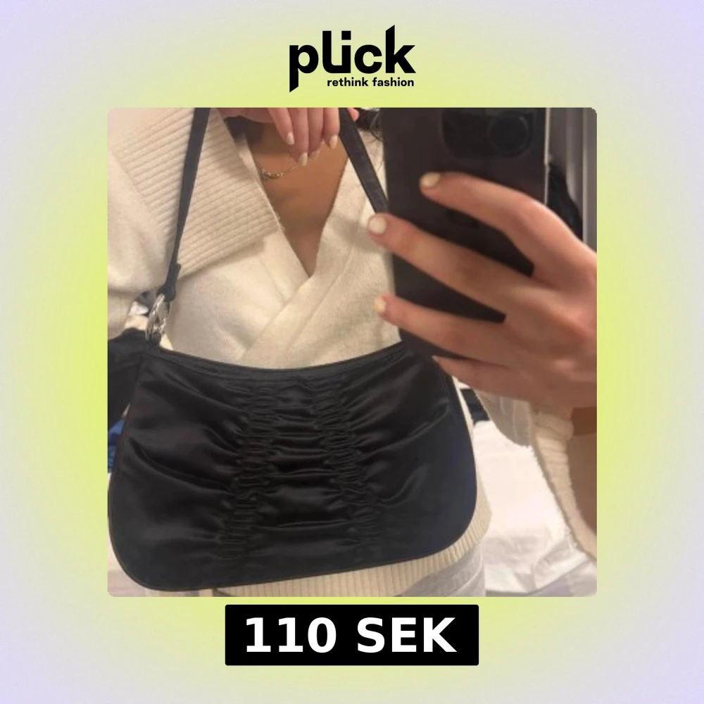 Snygg svart axelväska i glansigt satinmaterial med rynkade detaljer på framsidan. Väskan har justerbar axelrem och silvriga ringdetaljer. Perfekt storlek för det viktigaste och ger en trendig vibe till din outfit.