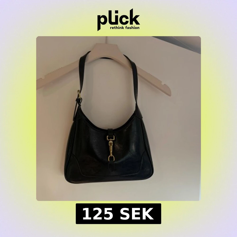 Snygg svart axelväska i skinn med stilren form och guldfärgad metallspänne framtill. Väskan har en justerbar axelrem och minimalistisk design som passar till många outfits. Perfekt storlek för det viktigaste och ger en classy vibe.