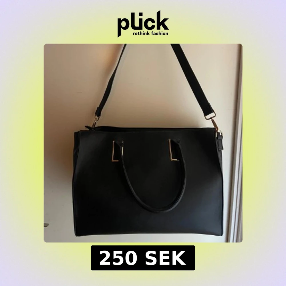 Stilren svart axelväska med både handtag och axelrem. Väskan har guldfärgade metalldetaljer och dragkedja upptill. Rymmer mycket och har en klassisk, boxig form. Perfekt för dig som vill ha en snygg och praktisk väska till vardagen. Båda sidor går även att knäppa. Pris går att diskuteras.