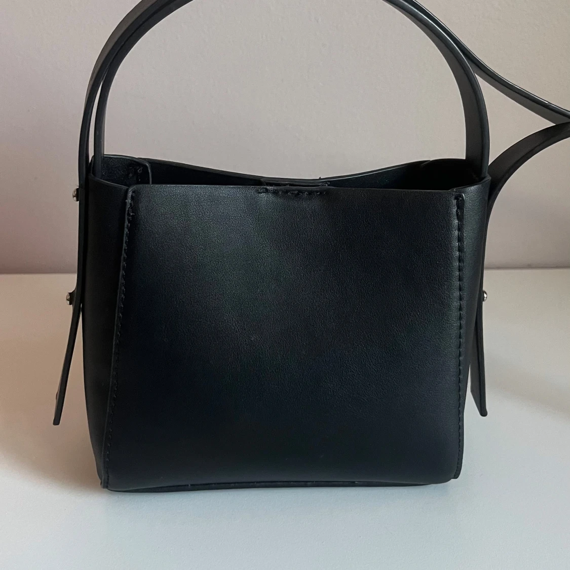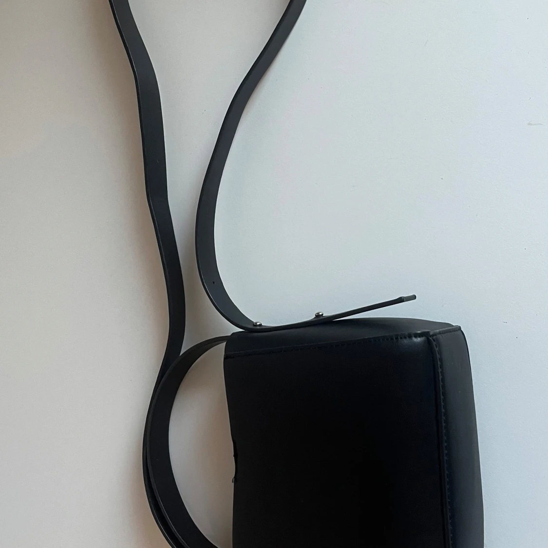 Snygg svart axelväska med stilren design och fyrkantig form. Väskan har ett långt axelband och stängs med magnetknapp. Perfekt storlek för det viktigaste och passar till många olika outfits.