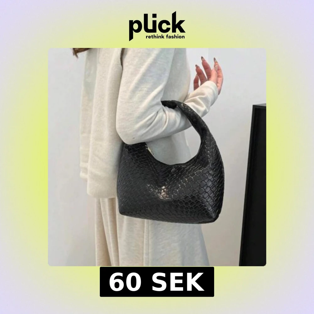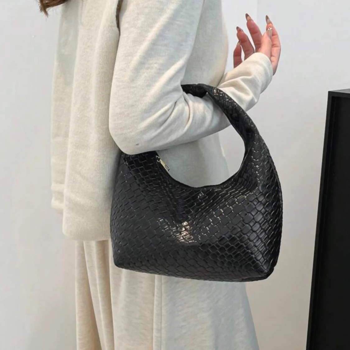 Snygg svart axelväska med trendig, rundad form och präglat mönster som ger en lyxig känsla. Väskan har ett kort handtag och är tillverkad i skinnimitation med reptilstruktur. Perfekt accessoar för att lyfta din outfit. Aldrig använd