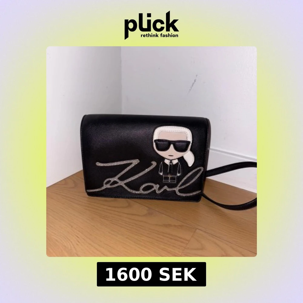 Svart axelväska från Karl Lagerfeld med silverfärgad kedja och justerbar rem. Framsidan har en cool Karl Lagerfeld-illustration och glittrig signatur. Väskan är i strukturerat skinn och har ett fack med mönstrat innerfoder.